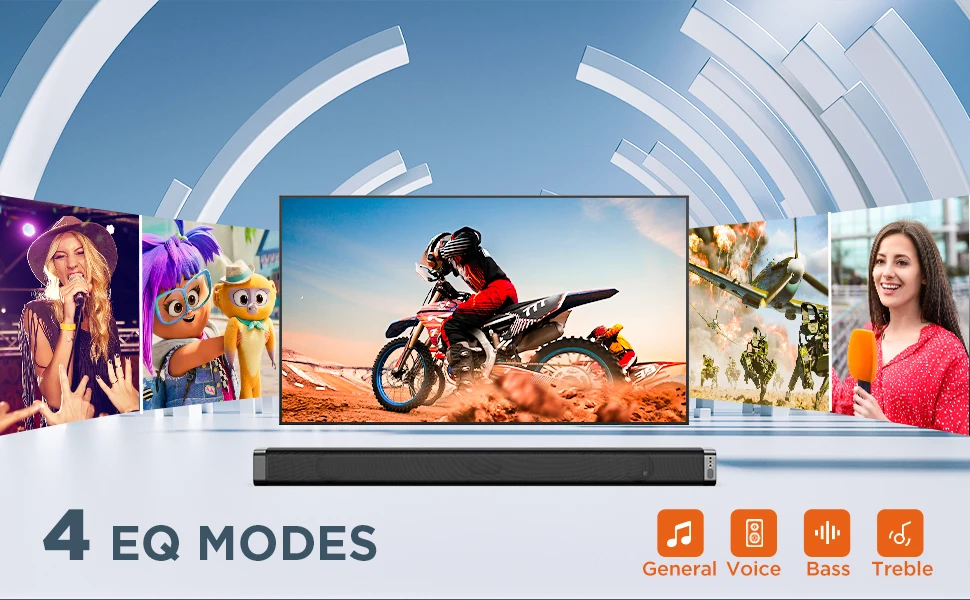 Эта звуковая панель мощностью 100 Вт имеет встроенные 4 полнодиапазонные колонки, звук может покрывать три диапазона высоких, средних и низких частот и обеспечивает стереозвук. Максимальный уровень звукового давления составляет 120 дБ для громкого и мощного звука.