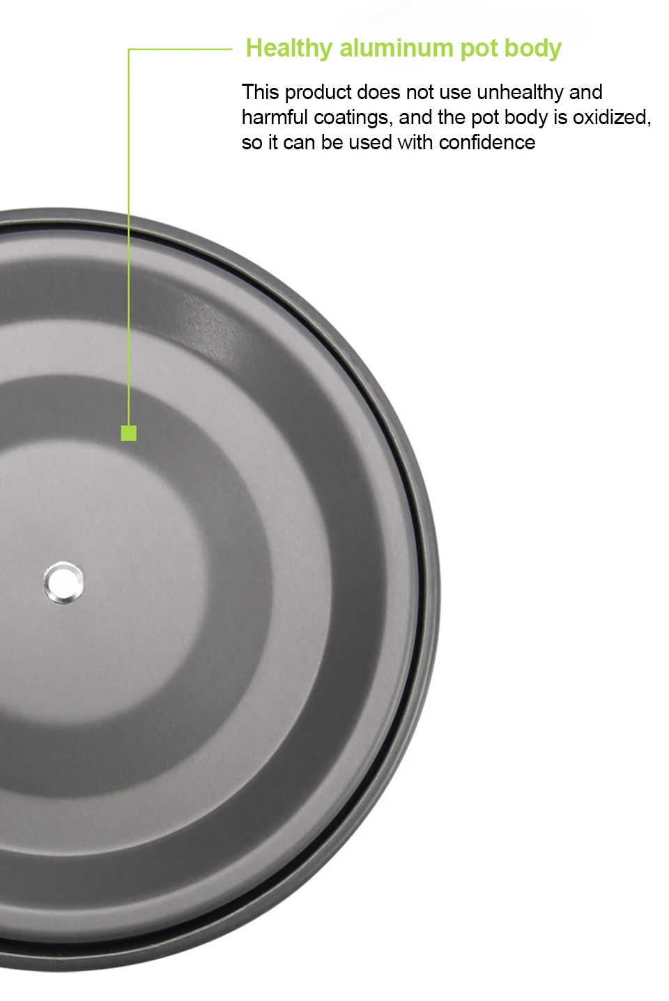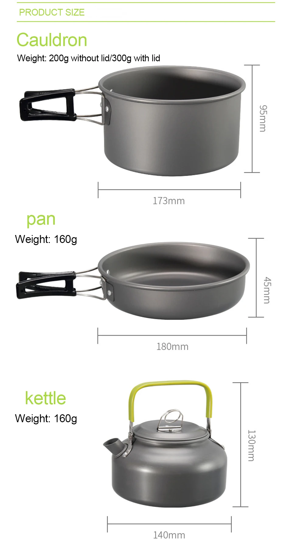 【High quality】 Safe and non-toxic anodized aluminium made frying pan cooking pot and teapot is Lightweight, durable, non-stick coating, easy-to-clean. The cookware kit can be heated quickly to add brilliance to the natural journey.
