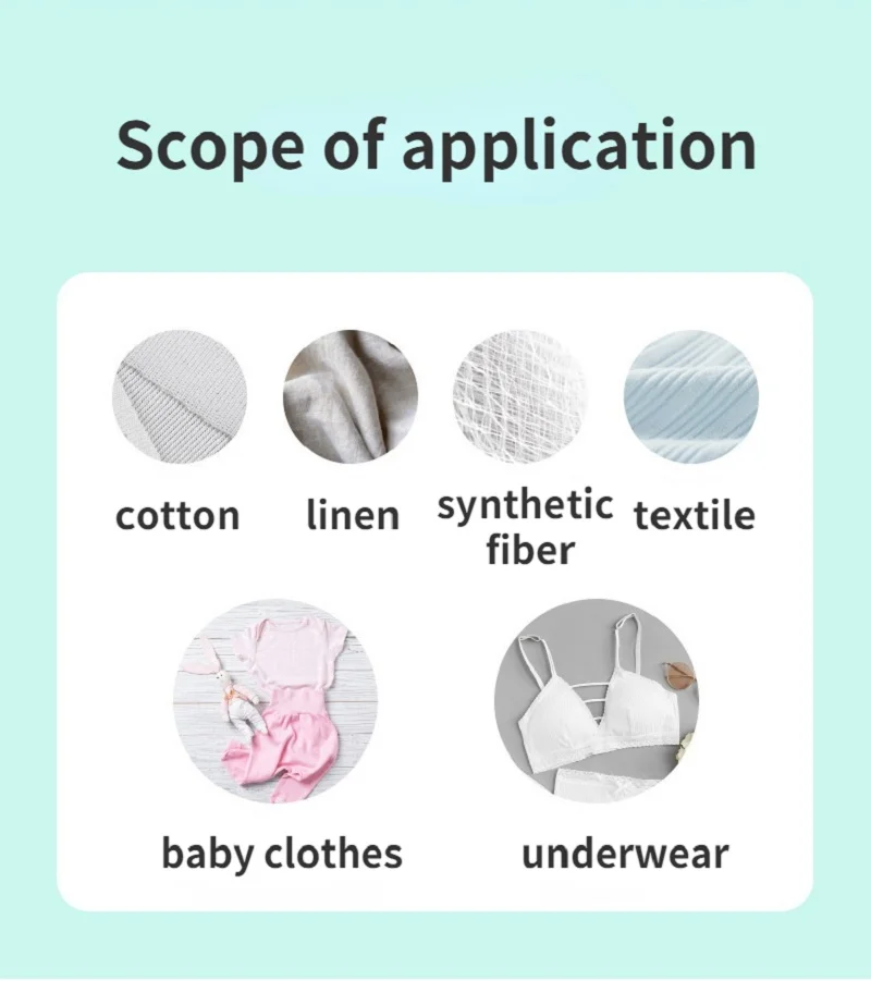 7. Область применения: подходит для хлопка, конопли, синтетического волокна, смешанного и т. д. (То же самое относится к детской одежде и нижнему белью)