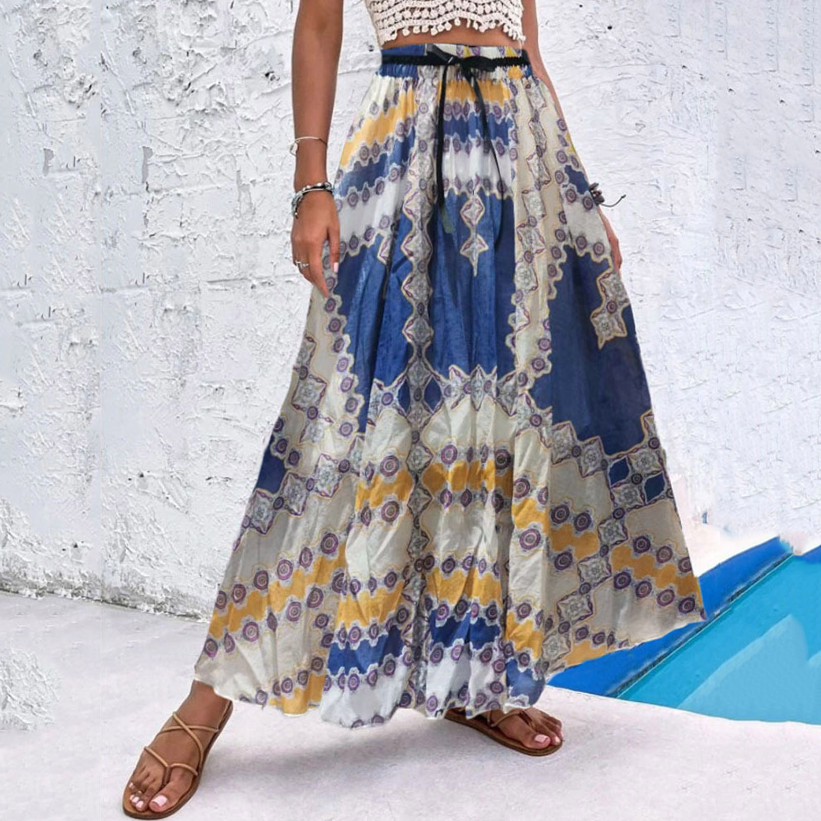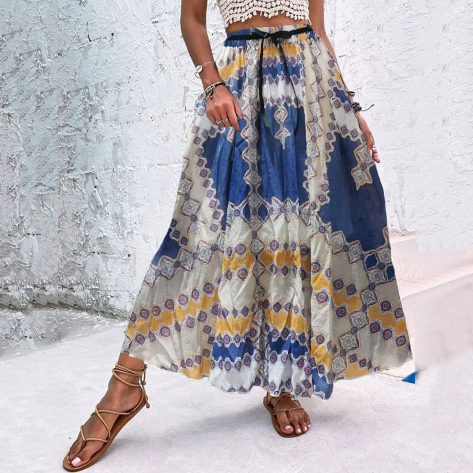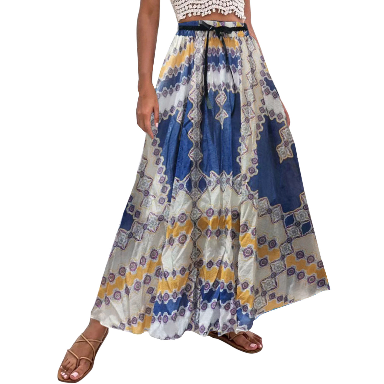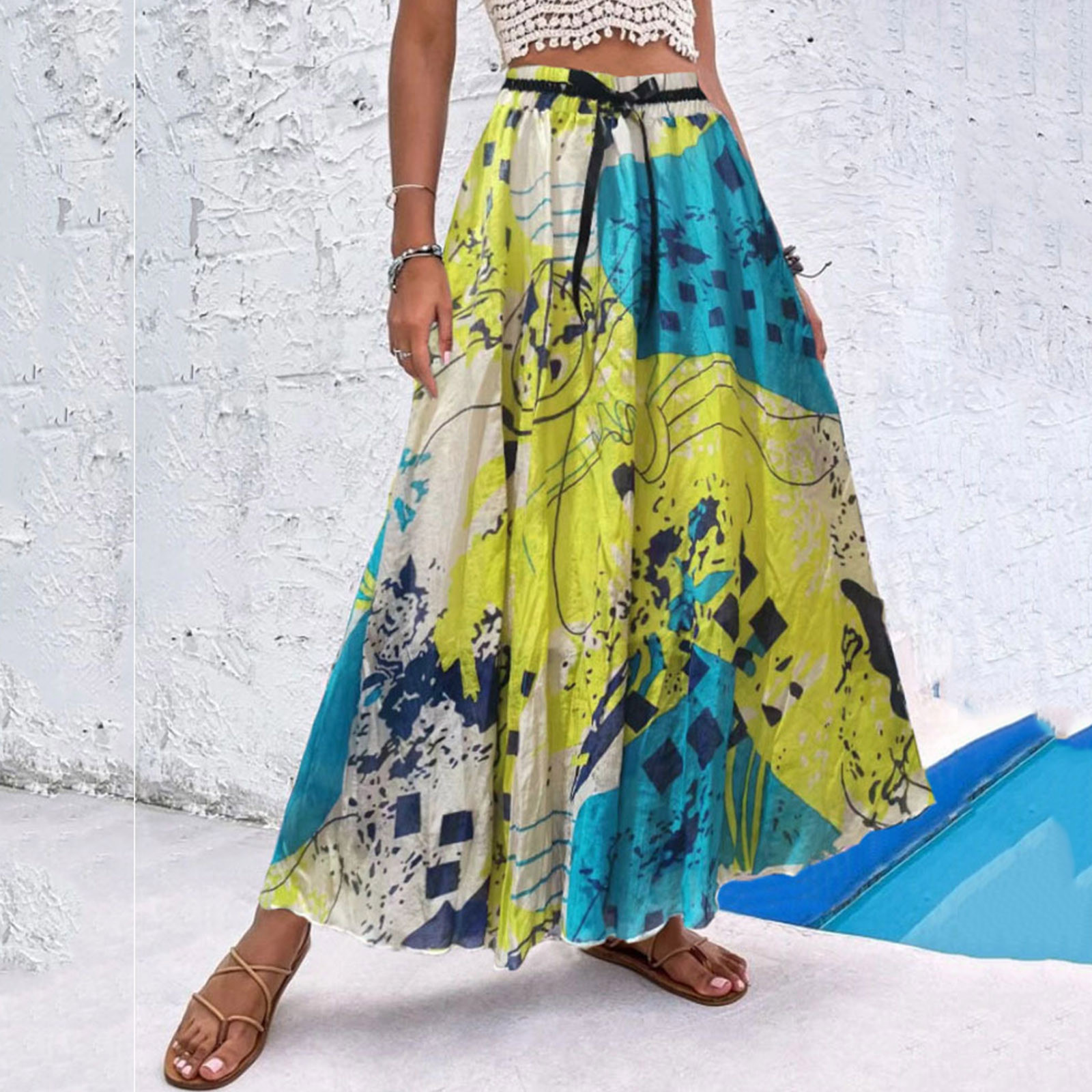 Эта юбка-макси с качелями подходит к универсальному образу, который можно носить случайно или одевать. Регулируемый дизайн на завязках в верхней части эластичного пояса делает эту летнюю пляжную юбку более удобной при ношении, и не беспокойтесь о том, что она упадет. Отлично сочетается с топами на бретелях, футболками, бикини, сандалиями, плоской подошвой, каблуками в жаркое лето.