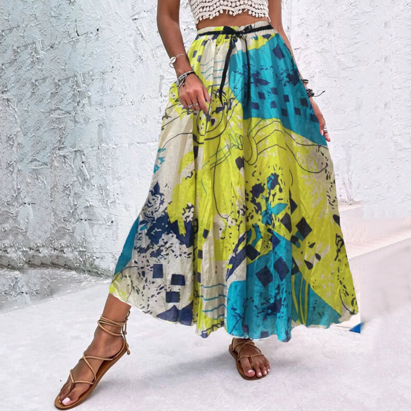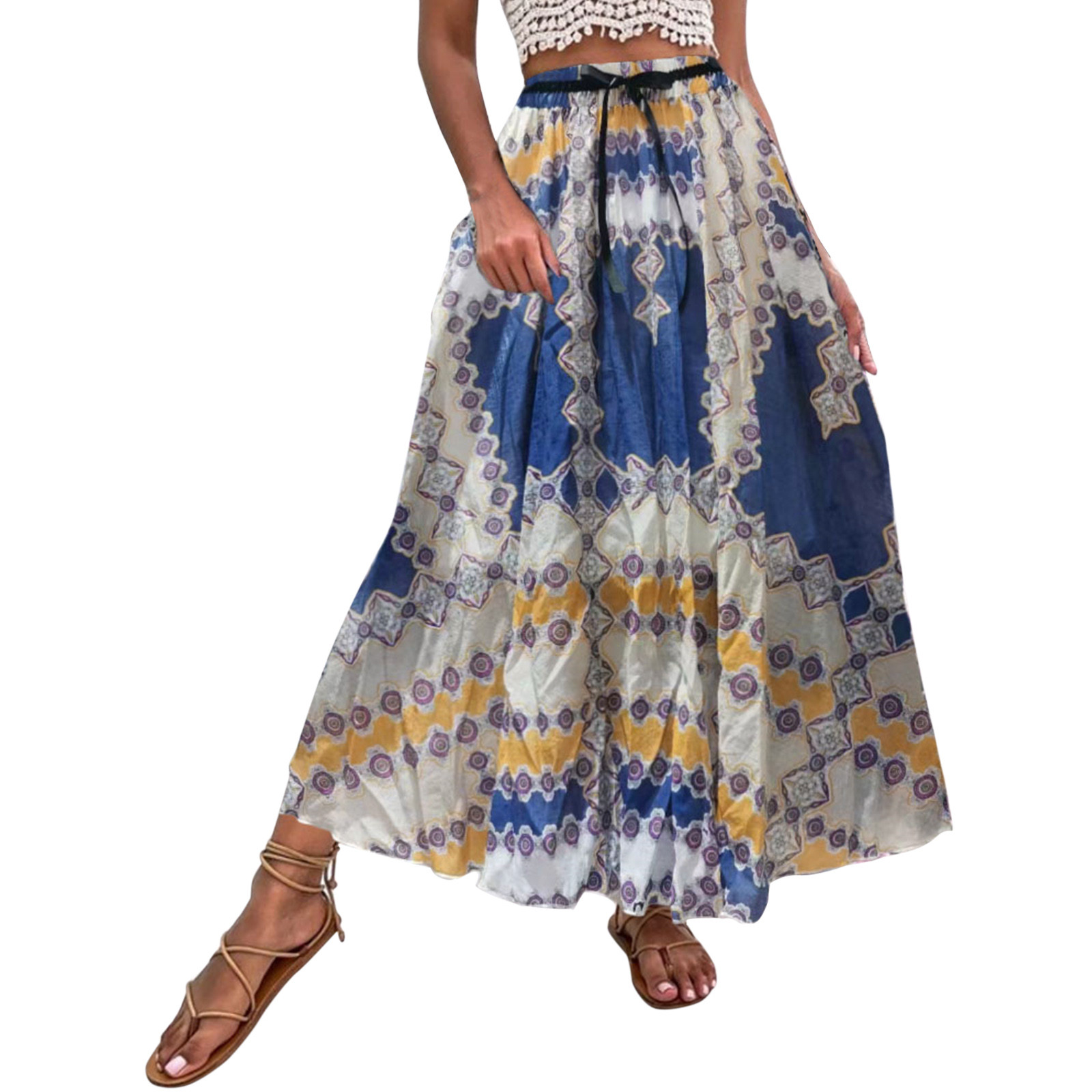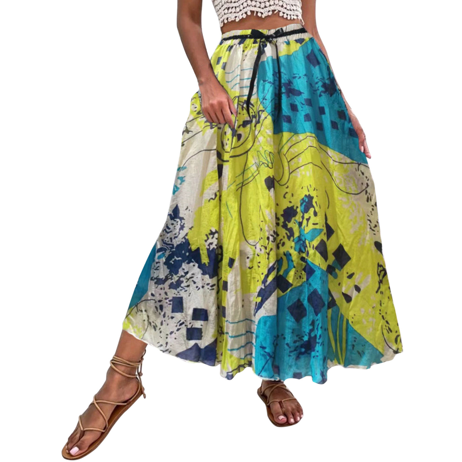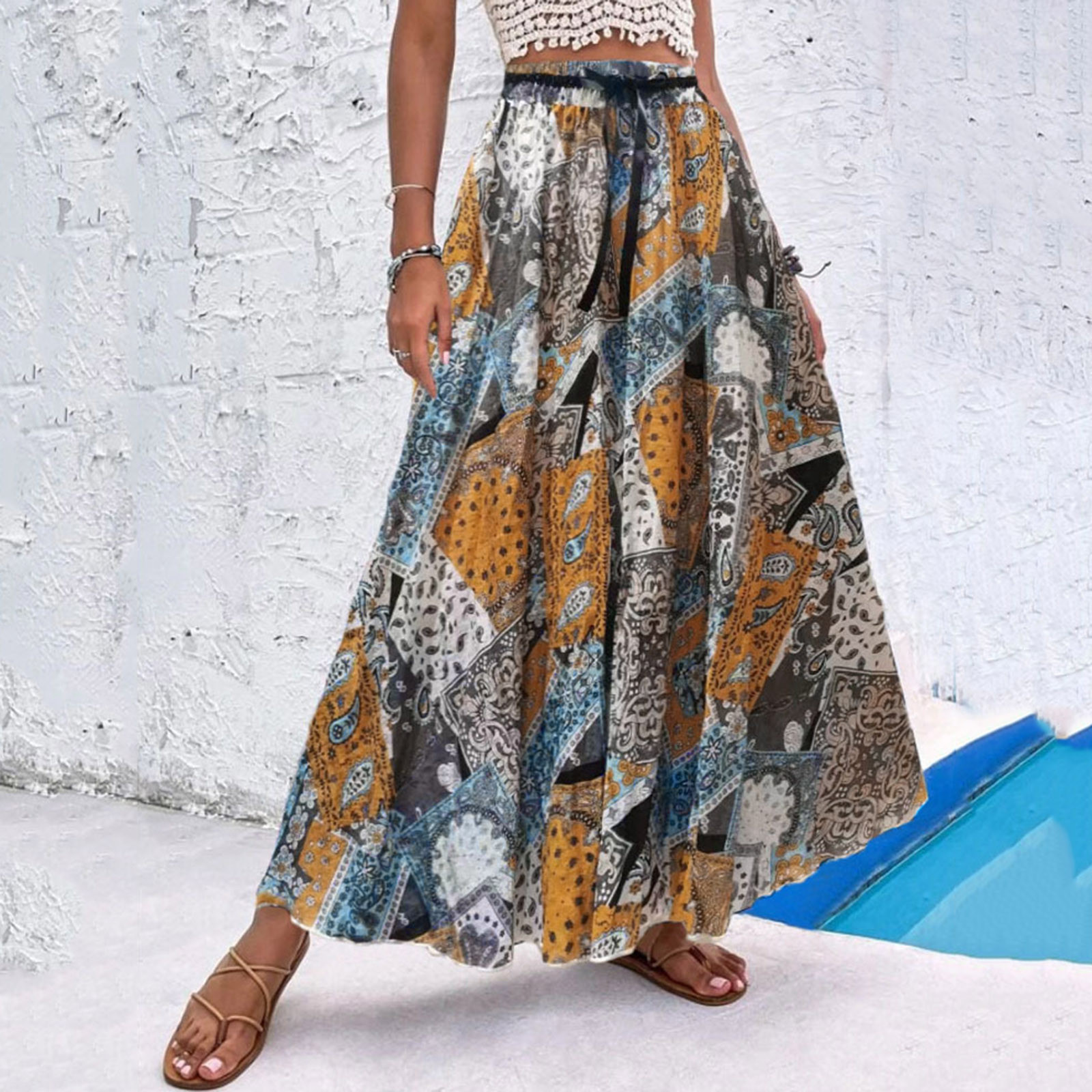 Эта юбка-макси с качелями подходит к универсальному образу, который можно носить случайно или одевать. Регулируемый дизайн на завязках в верхней части эластичного пояса делает эту летнюю пляжную юбку более удобной при ношении, и не беспокойтесь о том, что она упадет. Отлично сочетается с топами на бретелях, футболками, бикини, сандалиями, плоской подошвой, каблуками в жаркое лето.