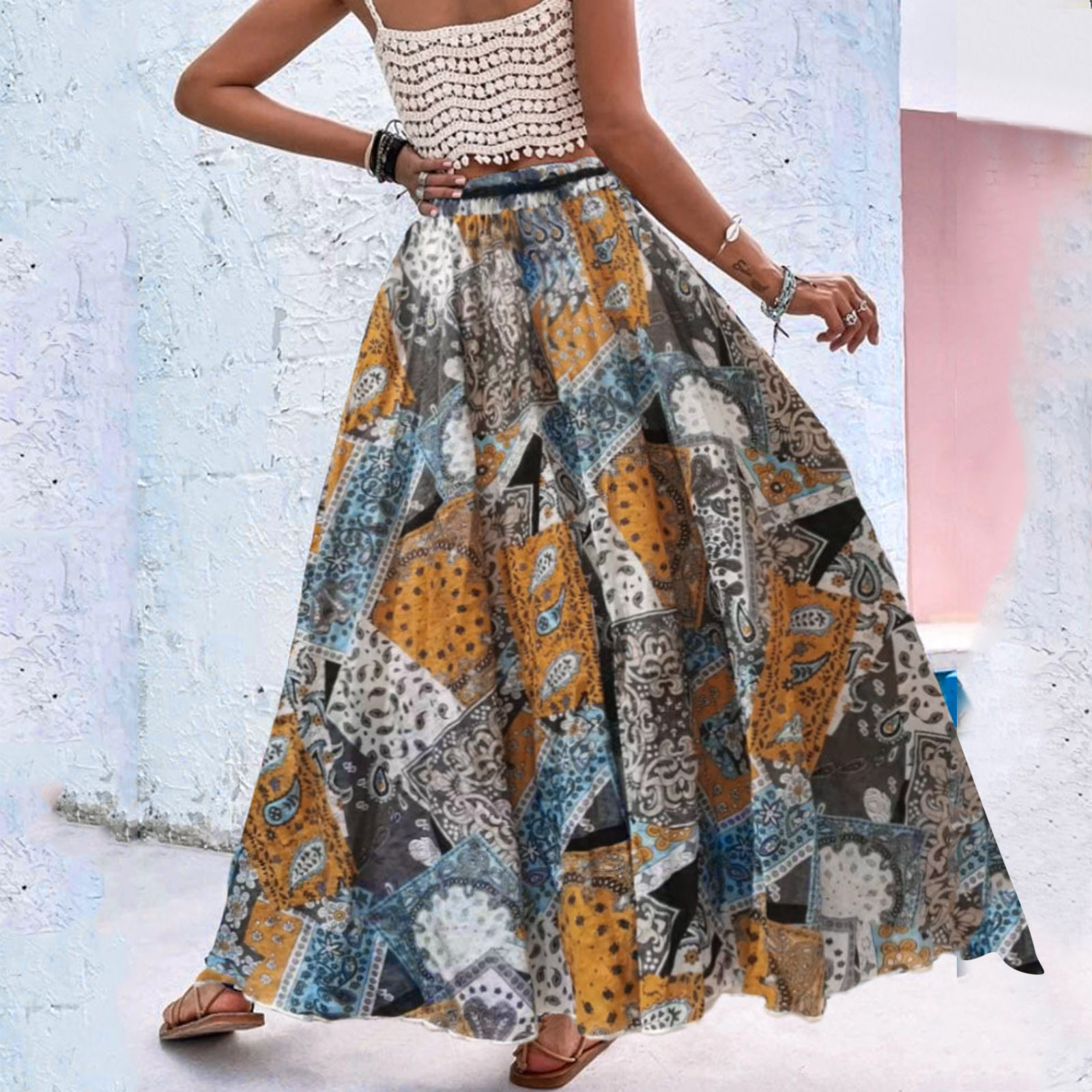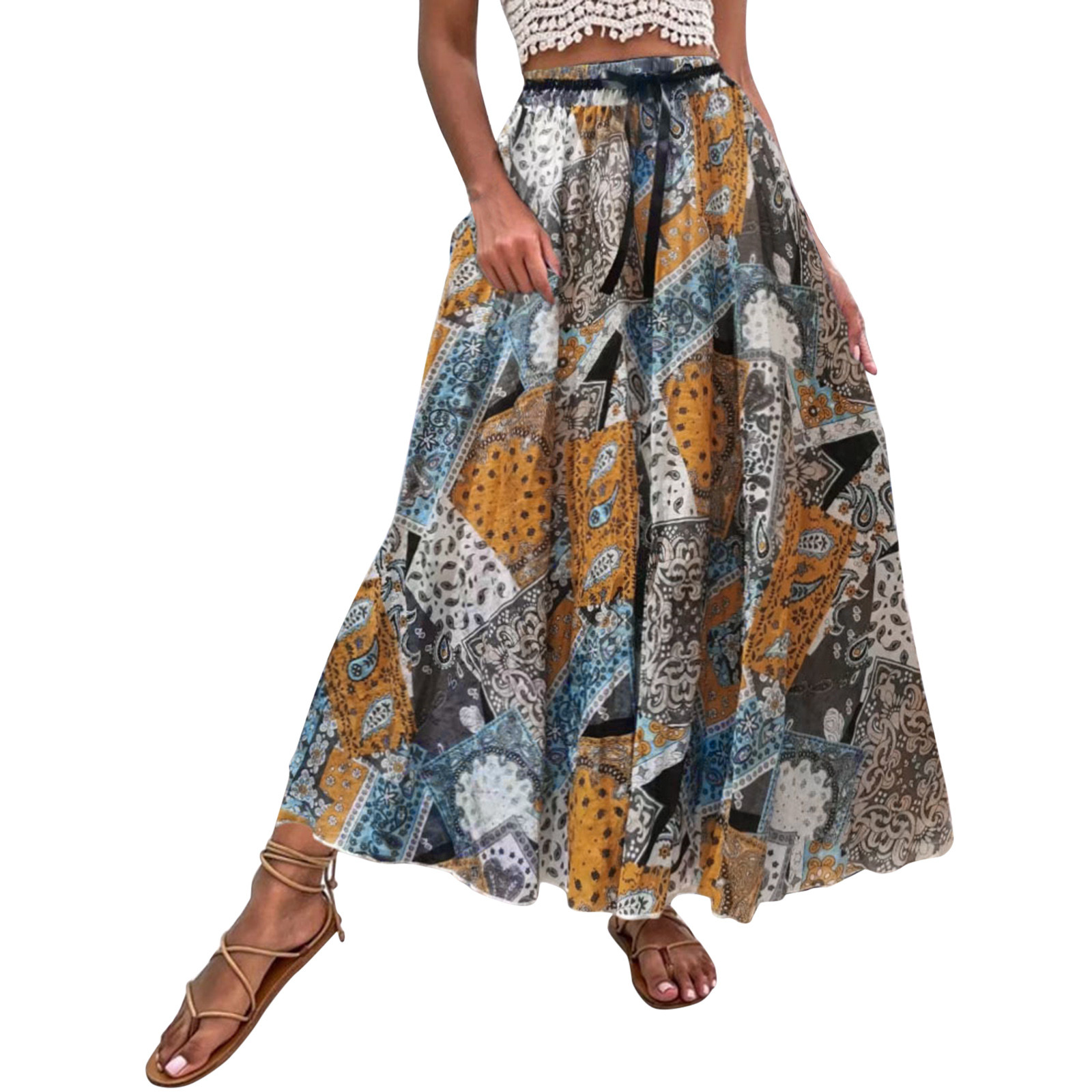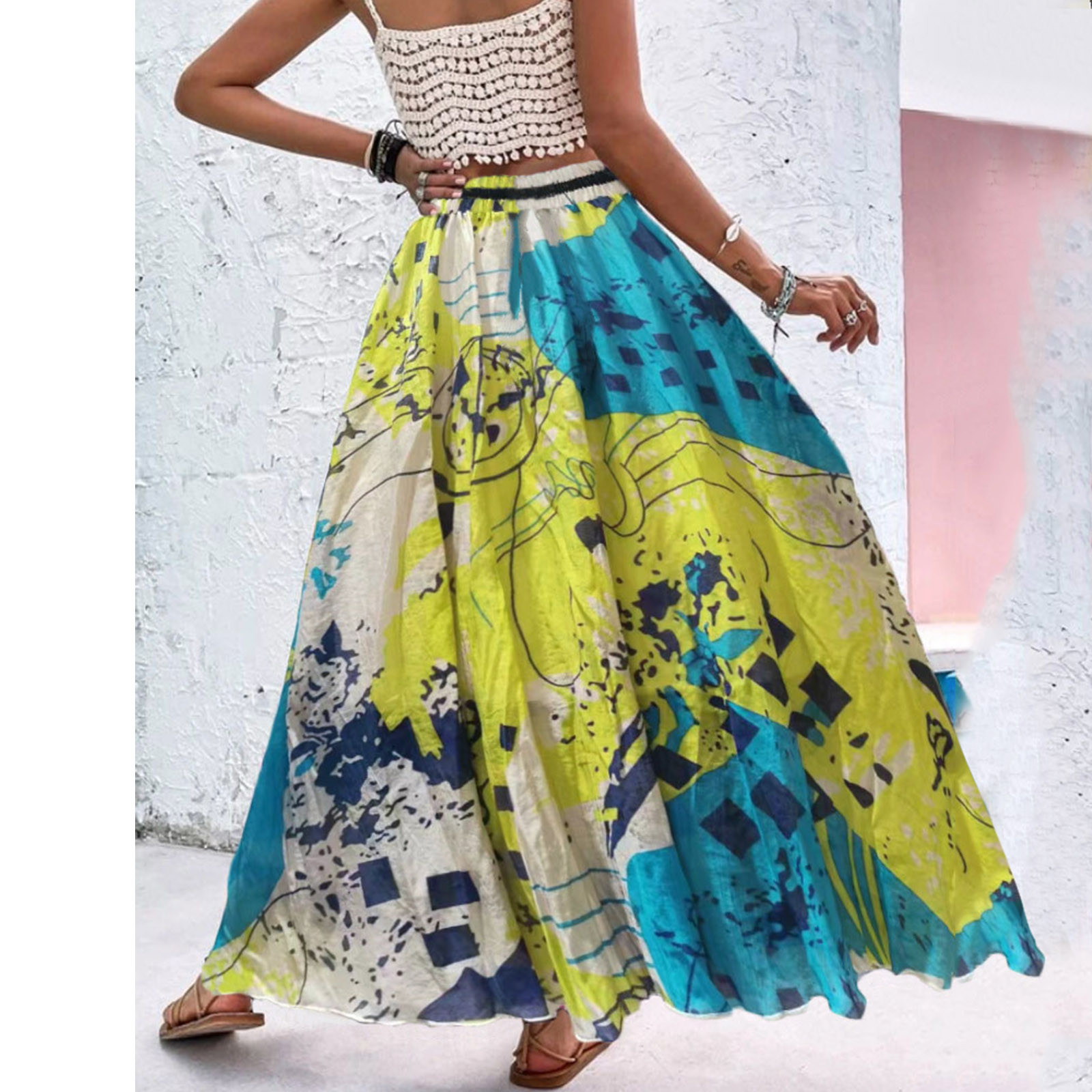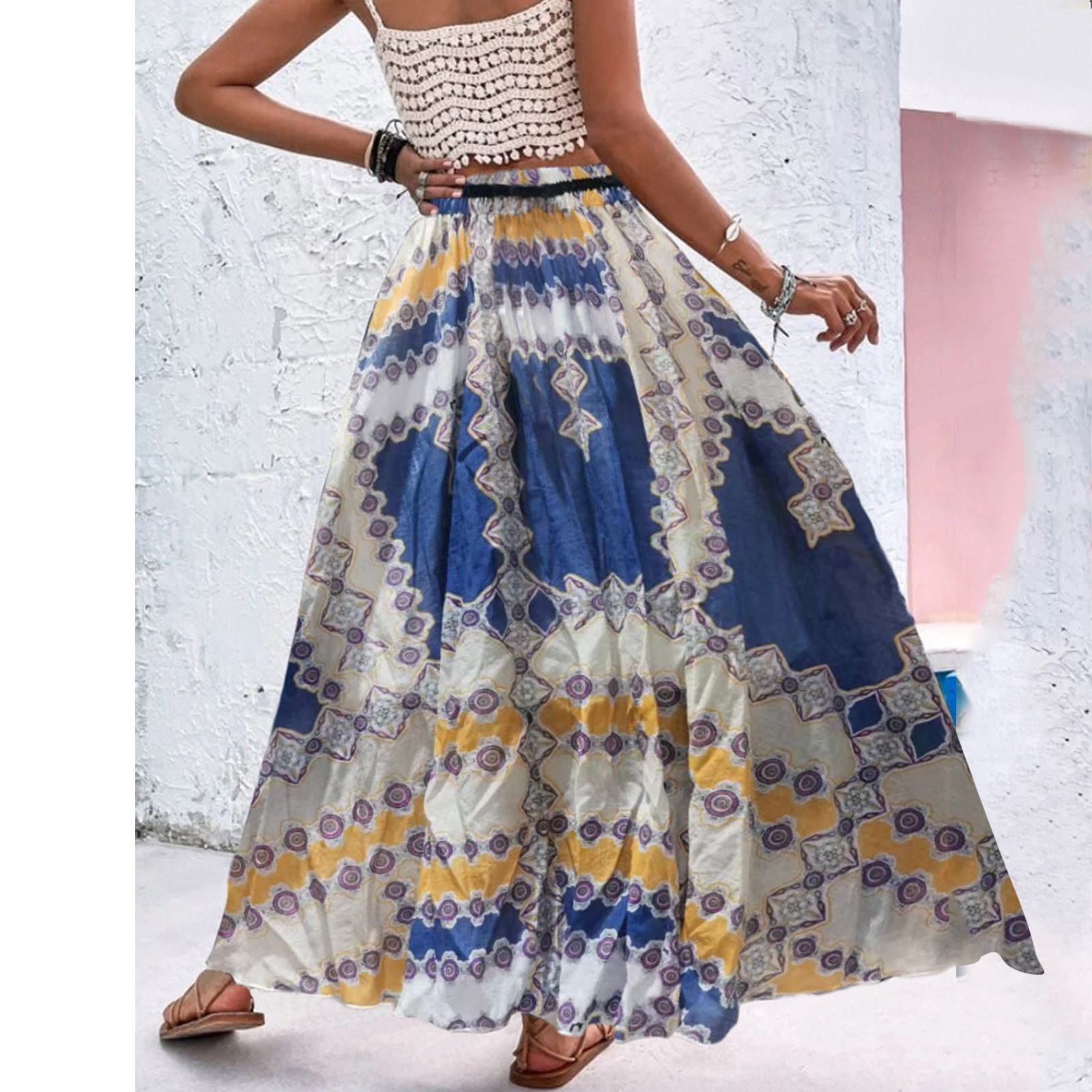 Эта юбка-макси с качелями подходит к универсальному образу, который можно носить случайно или одевать. Регулируемый дизайн на завязках в верхней части эластичного пояса делает эту летнюю пляжную юбку более удобной при ношении, и не беспокойтесь о том, что она упадет. Отлично сочетается с топами на бретелях, футболками, бикини, сандалиями, плоской подошвой, каблуками в жаркое лето.