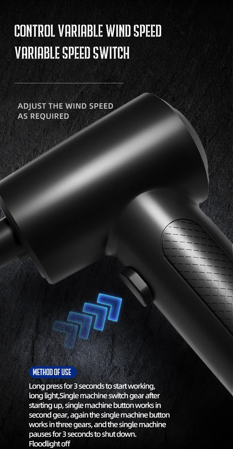 -Пыльник имеет 3 скорости ветра (27000 об/мин, 38000 об/мин, 51000 об/мин). Три режима воздушного потока подходят для очистки различных устройств. Устойчивый, чистый поток воздуха не повредит ваши ценные вещи. Длительное нажатие на выключатель в течение 3 секунд может включать и выключать устройство. Короткий пресс-переключатель может переключаться на три скорости ветра. Это практично и просто.