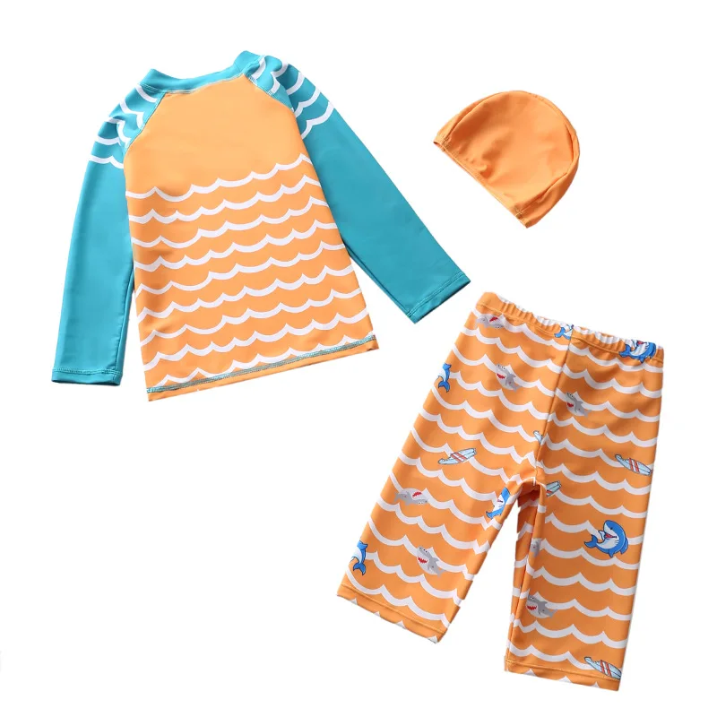 With UPF 50+ sun protection with Shark & dinosaur print, this rashguard set keeps him cute and protected all day long.