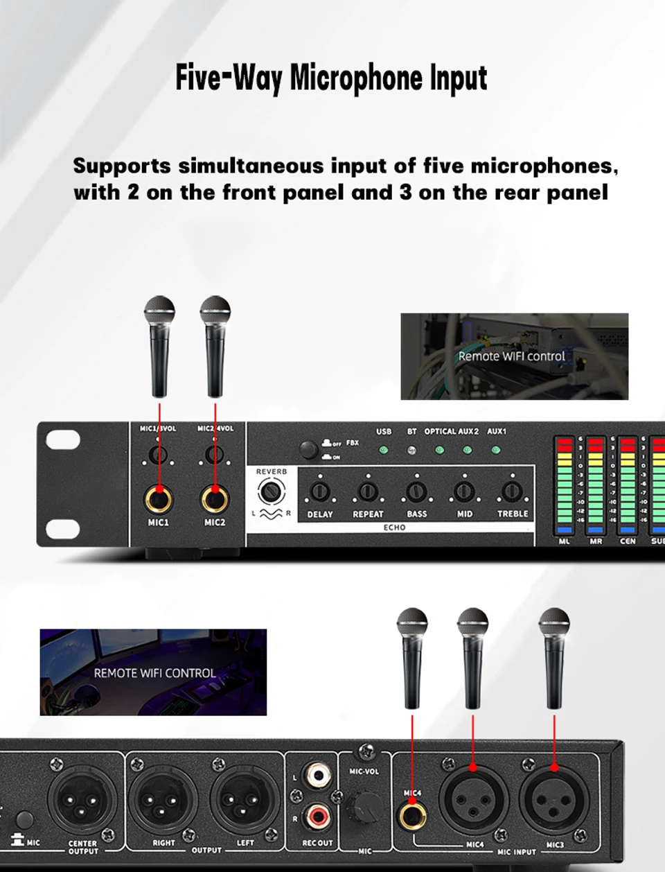 Design дизайн канала центрального выхода может выбрать соотношение музыки/реверберации или чистый человеческий голос; И может самостоятельно контролировать громкость и высокую, среднюю и низкую частоту регулировки.