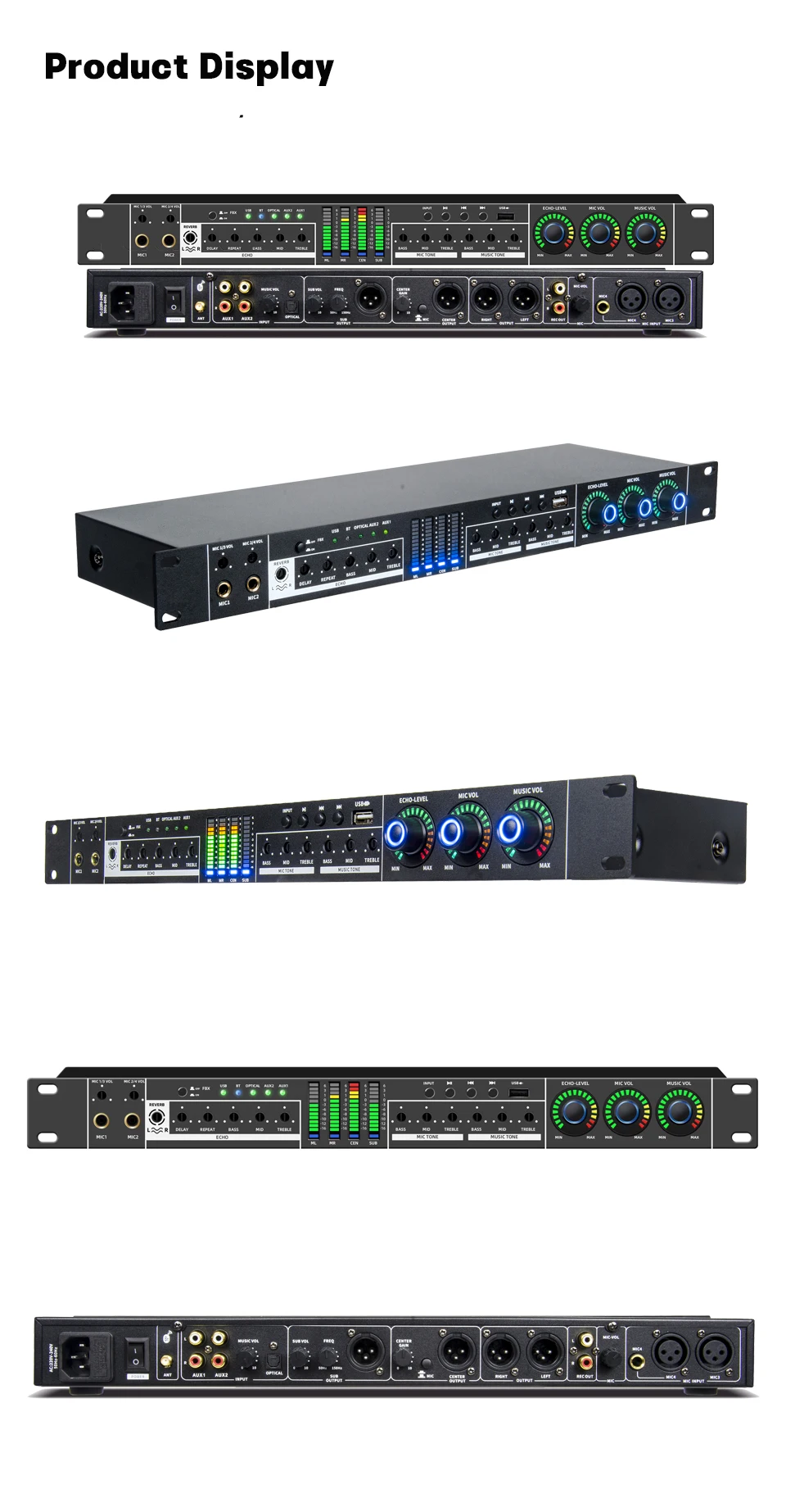 Professional профессиональный Предварительный усилитель принимает обработку двойного режима реверберации, что делает вокальный эффект более обильным, естественным и прозрачным. Это высококачественный Гладкий естественный милый стиль стерео двойной реверберации и многоцелевой эффект караоке. Выход имеет передние (задние) левый и правый каналы, центральный канал и субwoof частотный канал. И он очень прост и удобен в использовании, как усилитель караоке.
