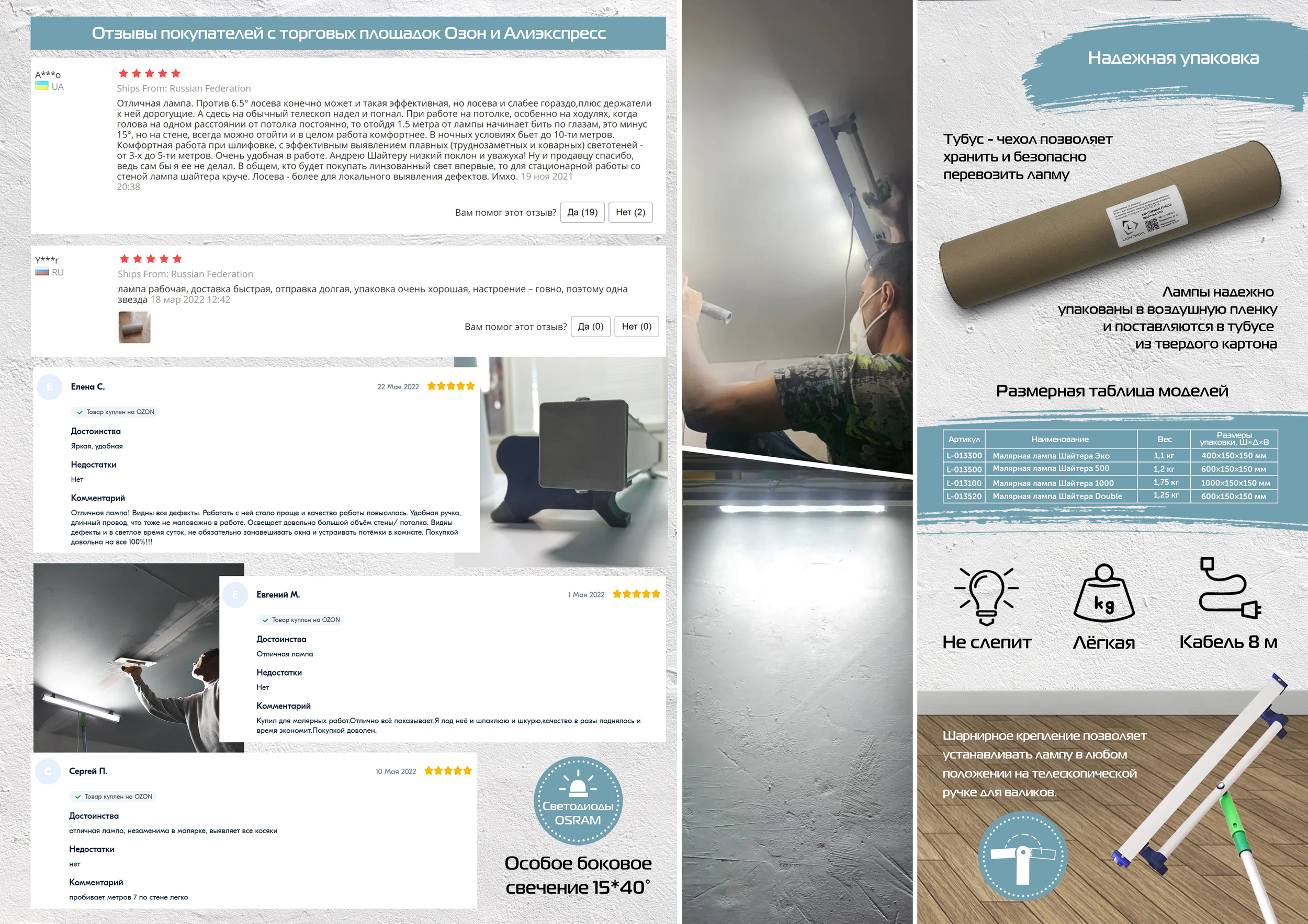 Длина лампы 100 см что является преимуществом, обеспечивая одновременно и большую площадь освещения и небольшие размеры что обеспечивает удобное пользование в стесненных пространствах.Длинный 8 метровый кабель позволит избавиться от дополнительных удлинителей, а надёжный влагозащищенный блок питания не будет тревожить Вас мыслями что он выйдет из строя из-за пыли или влаги которая присутствует во время ремонтных работ.