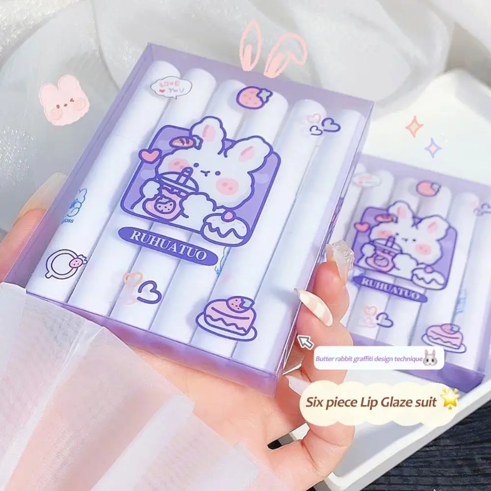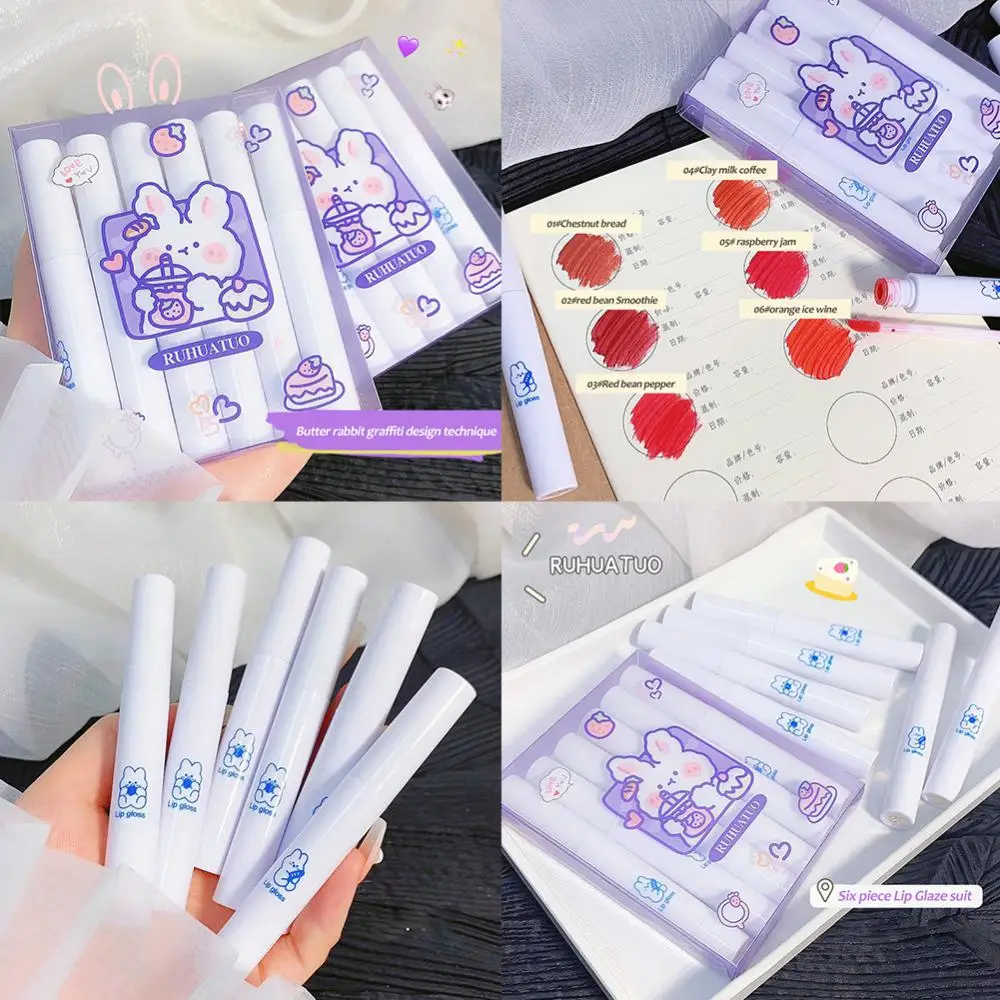 Блеск для губ Ruhuatuo, 6 шт./комплект, милый кролик, глазурь для губ, водостойкая, не выцветает, антипригарная чашка, матовая бархатная помада, макияж, макияж