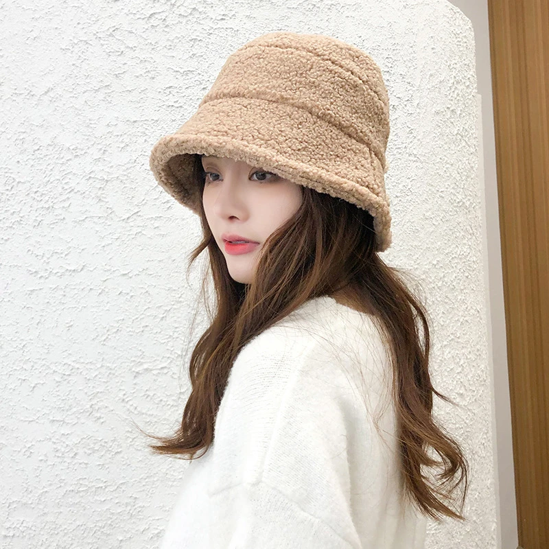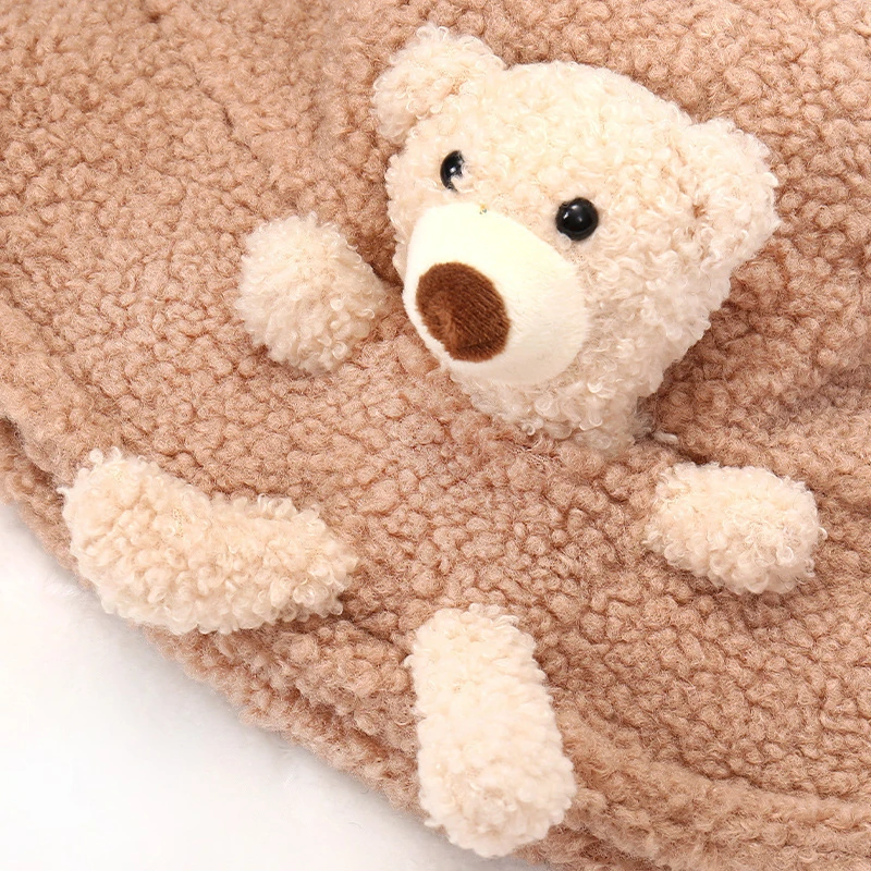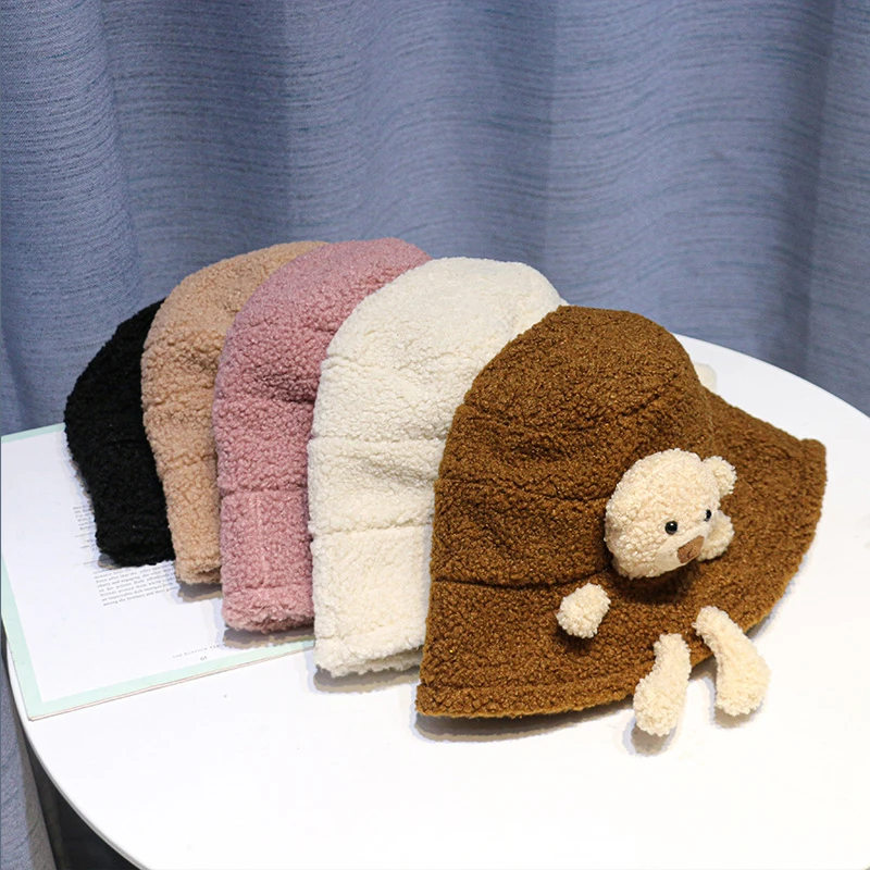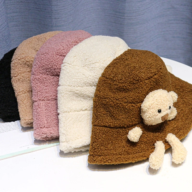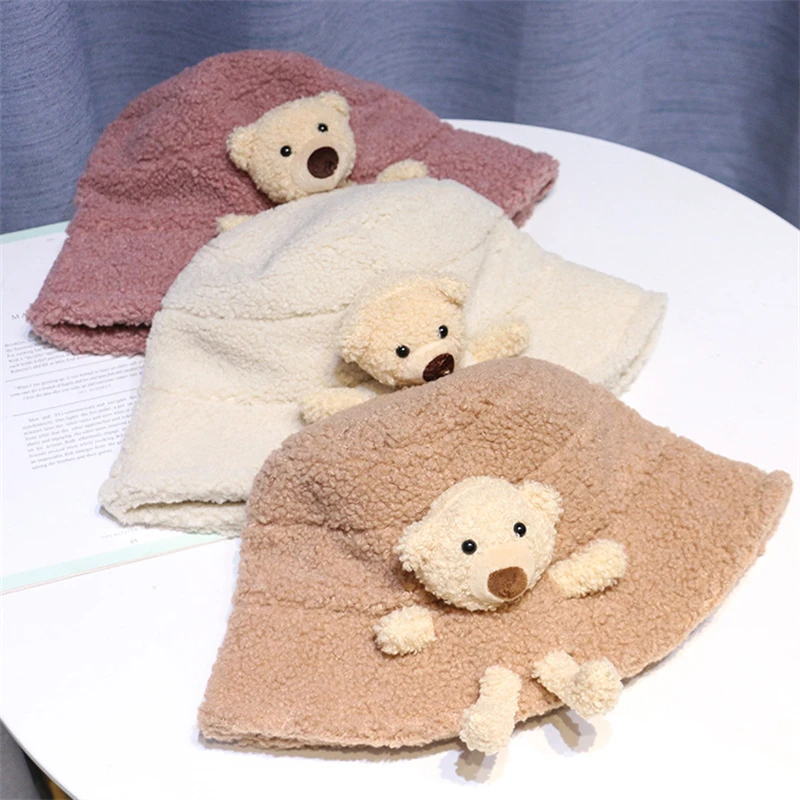 Утолщенная пушистая теплая шапка-ведро, сплошной цвет, милый 3D мультяшный плюшевый мишка украшен.