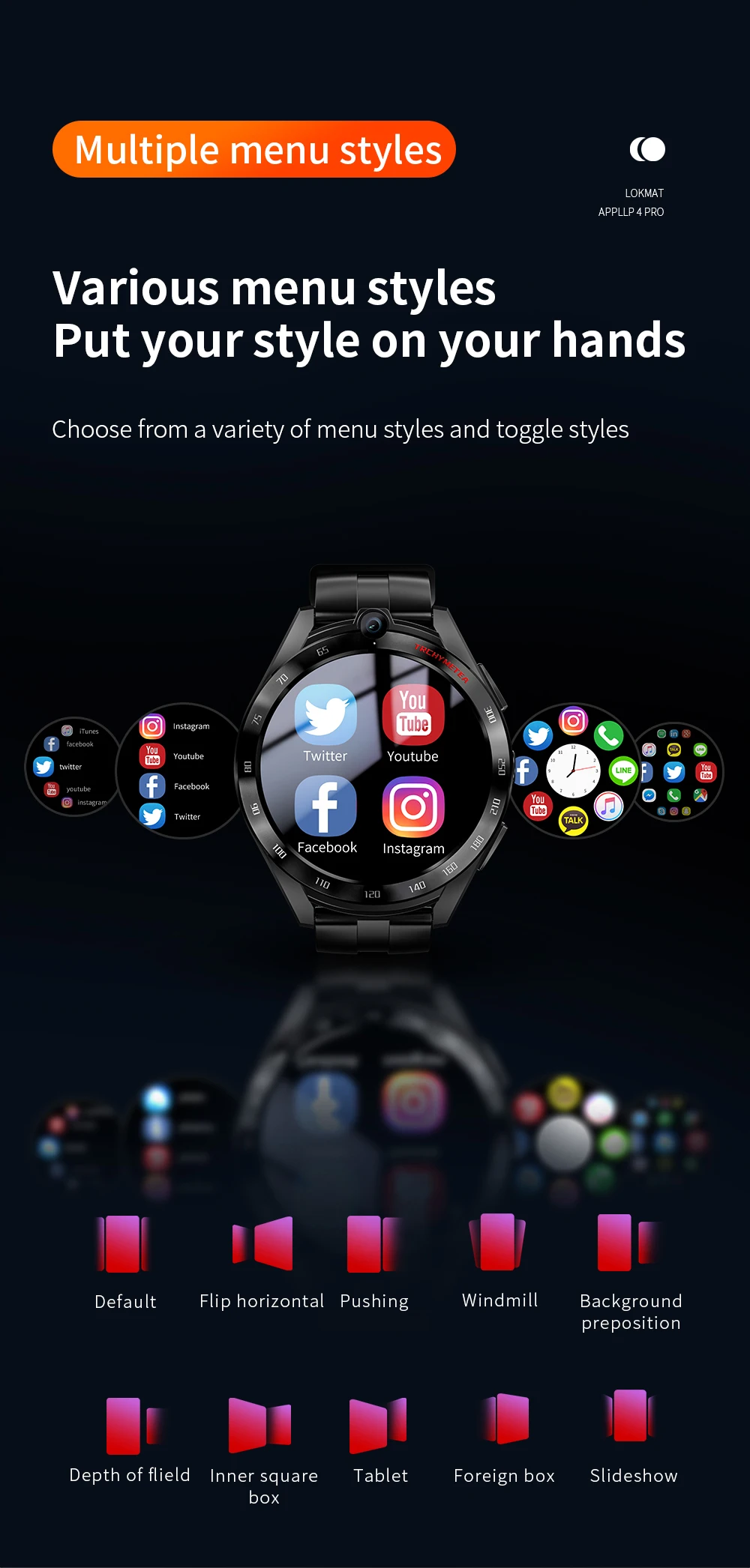 Телефон, контакты, SMS, настройки, рынок часов, настройки рабочего стола, браузер, календарь, камера, галерея, музыка, управление файлами, будильник, запись,