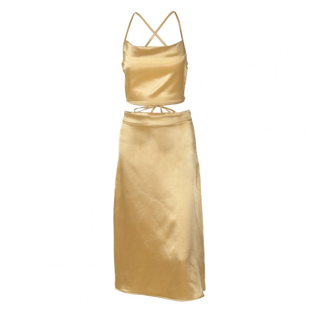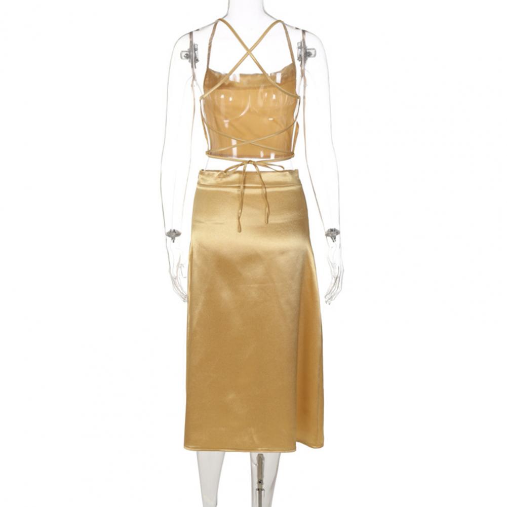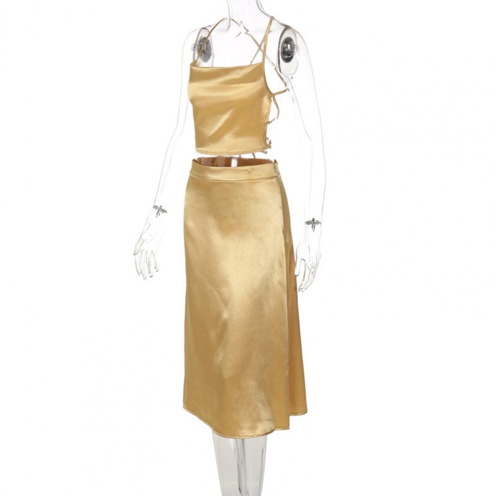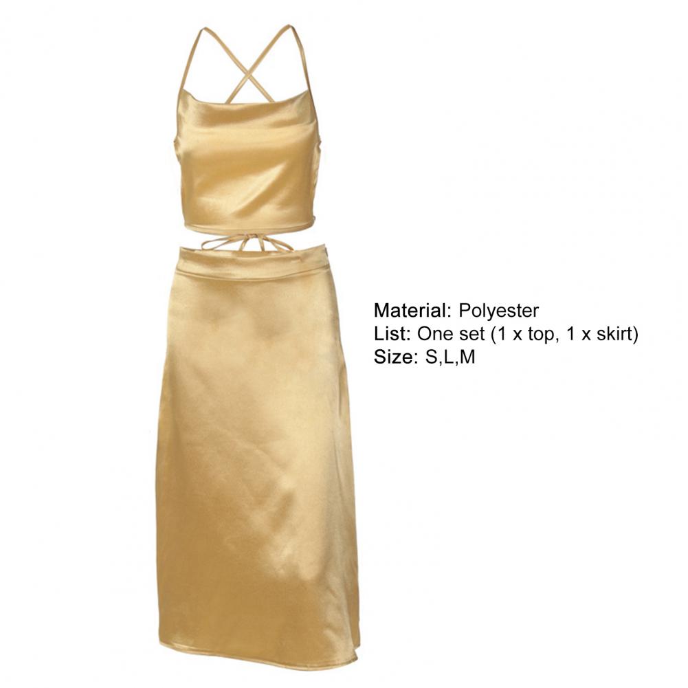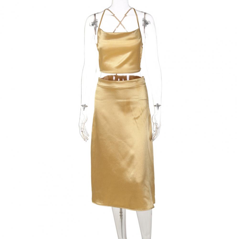 1 комплект, клубный комплект с топом и юбкой, однотонный, длина до середины икры, гладкая поверхность, легко сочетается с облегающим топом с лямкой на шее, без рукавов, на тонких бретельках, с открытой спиной, вечерние костюмы с топом и юбкой, праздничная одежда