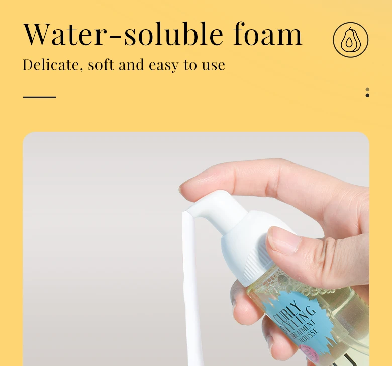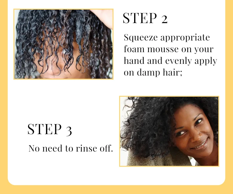 Шаг 2: выдавите соответствующее количество пенного Мусса на руки и равномерно нанесите на влажные волосы без ополаскивания.