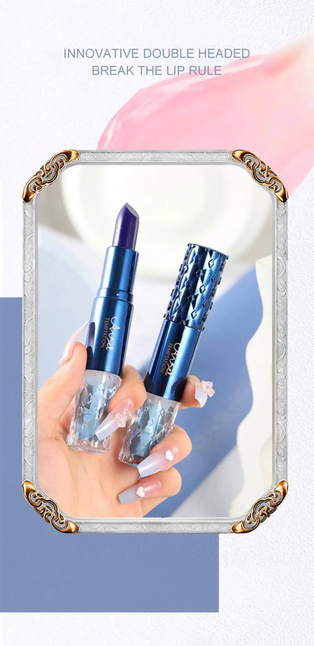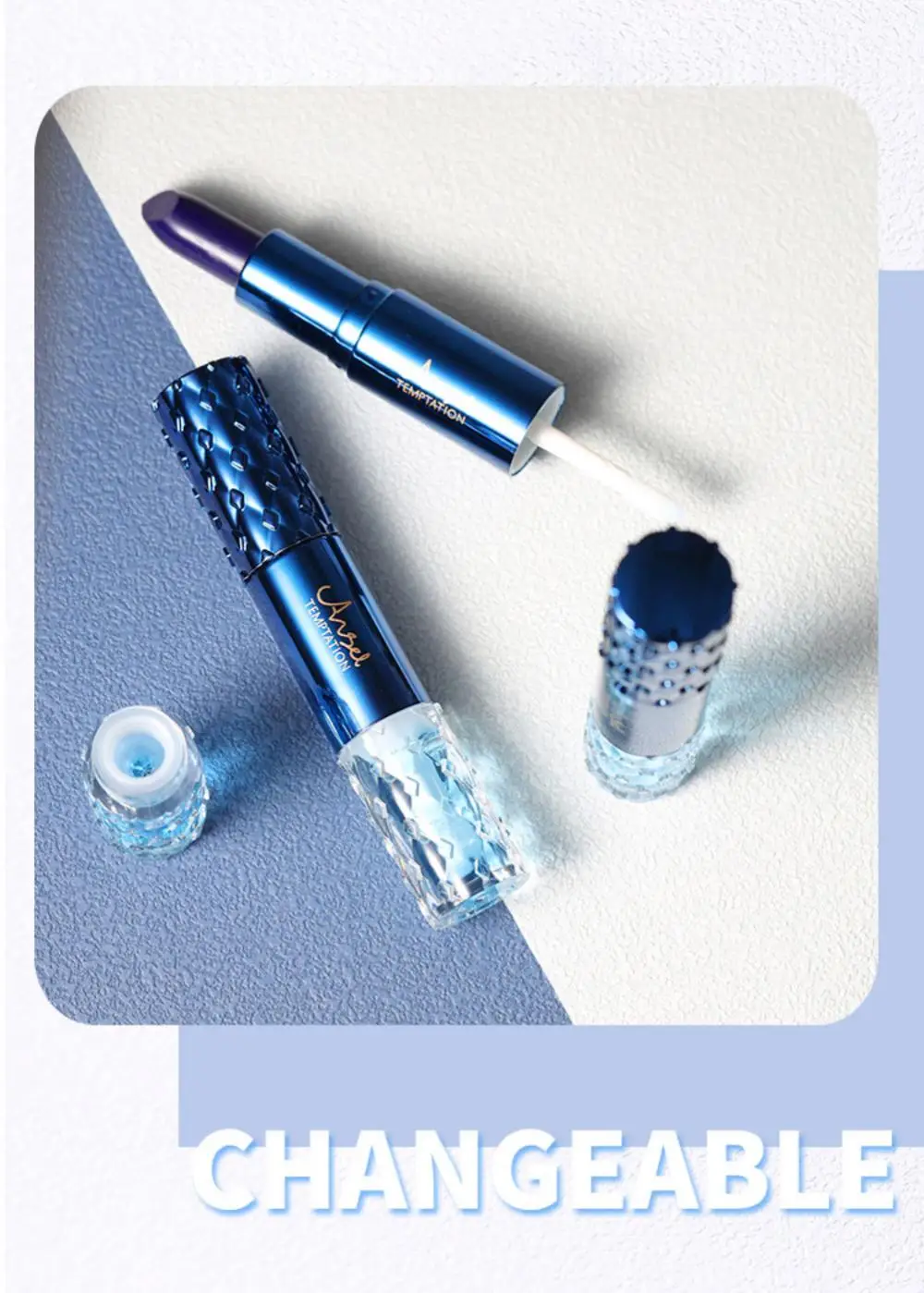 1. The product adopts a double-ended design, one is a blue enchantress temperature-sensitive color-changing lipstick, and the other is a lip raincoat, waterproof and color-locking, which is more convenient to use.