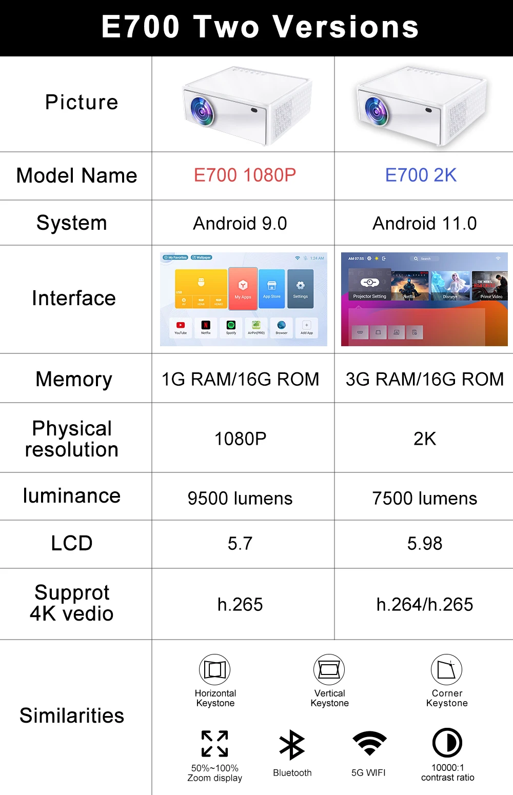 По сравнению с 1G оперативной памяти, E700 3G's storage обеспечивает больше временного места для хранения данных для операционной системы и запущенных программ смарт-проектора. Чем больше память, тем больше программ можно запускать в фоновом режиме проектора, и скорость работы будет быстрее.