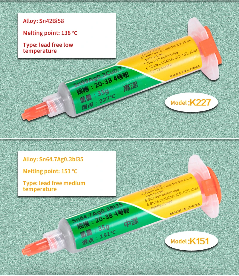 В шприц устанавливается низкотемпературная паяльная паста, которую легко распределить и использовать. Срок годности составляет 6 месяцев при комнатной температуре.