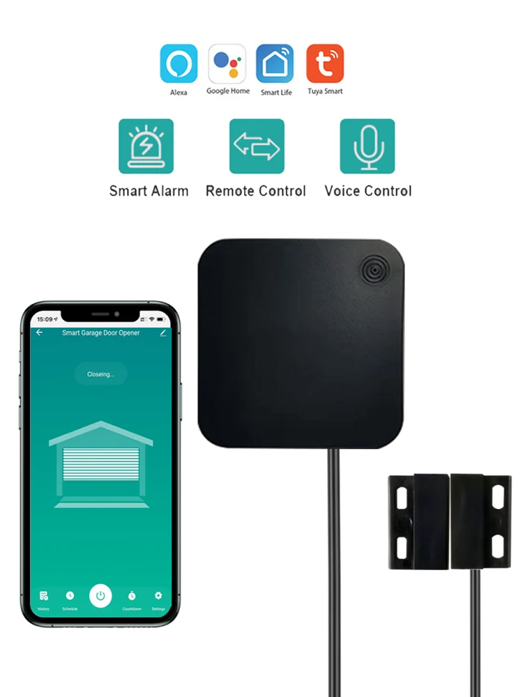 Это интеллектуальный контроллер двери гаража, вы можете открыть/закрыть и контролировать вашу дверь гаража или ворота из любого места. Это сделает ваш дом умнее.