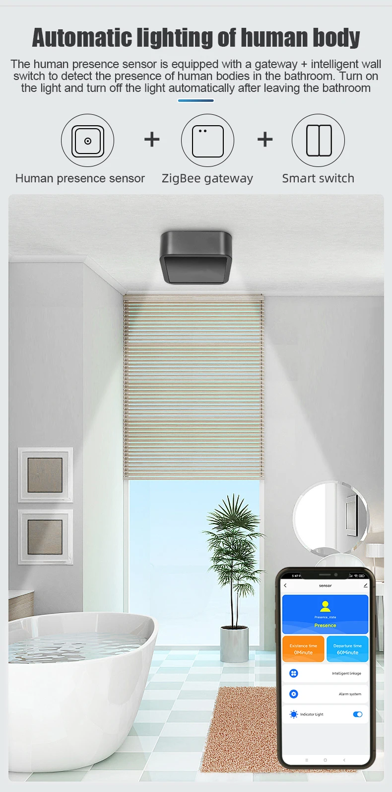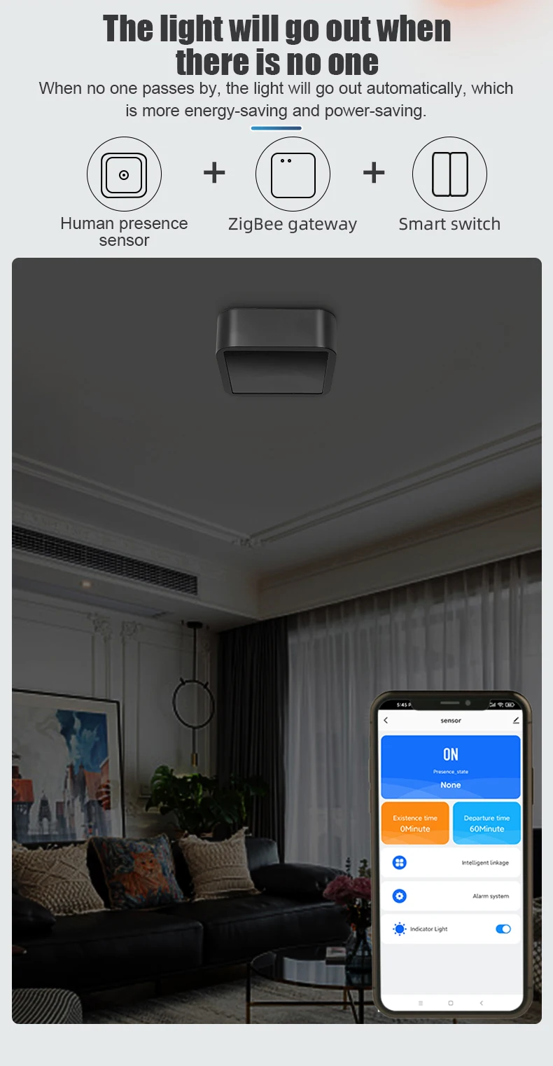 Датчик присутствия человека использует принцип радиолокационной микроволновой печи и имеет функции человеческого присутствия, человеческой неподвижности, человеческого микро-движения и обнаружения человеческого движения.