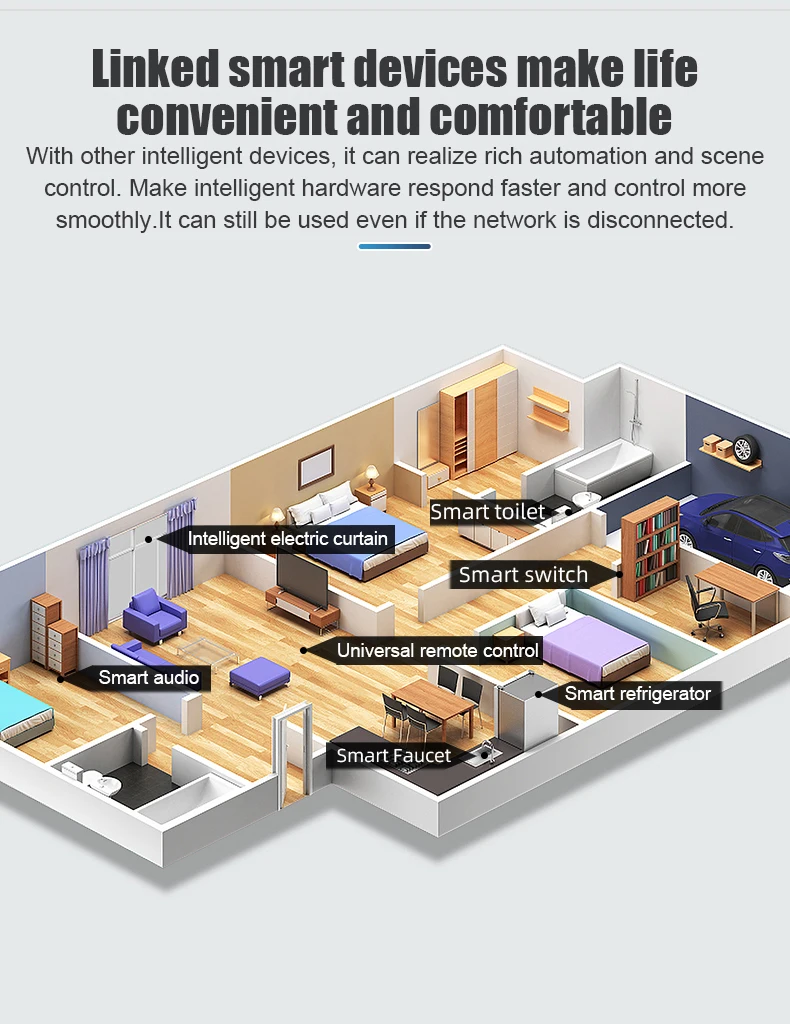 С другими интеллектуальными устройствами, он может реализовать богатую автоматизацию и контроль сцены. Сделайте умное оборудование более быстрым и контролируемым с утра. Он все еще может использоваться, даже если Сеть отключена.