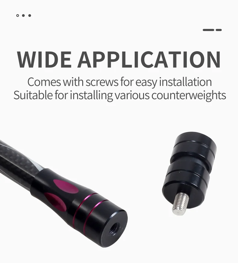 ◆ Амортизирующий противовес может быть разобран, и противовес может быть увеличен или уменьшен в соответствии с потребностями стрельбы из лука, и разборка проста и удобна◆ Основной корпус изготовлен из углеродного материала, а основной корпус изготовлен из углеродного материала, который легче по весу и лучше в стабильности◆ Двухцветное анодирование, передовая технология двухцветного анодирования не легко выцветает◆ Широкий спектр применений, легко устанавливается с помощью автономных винтов, подходит для установки различных противовесов