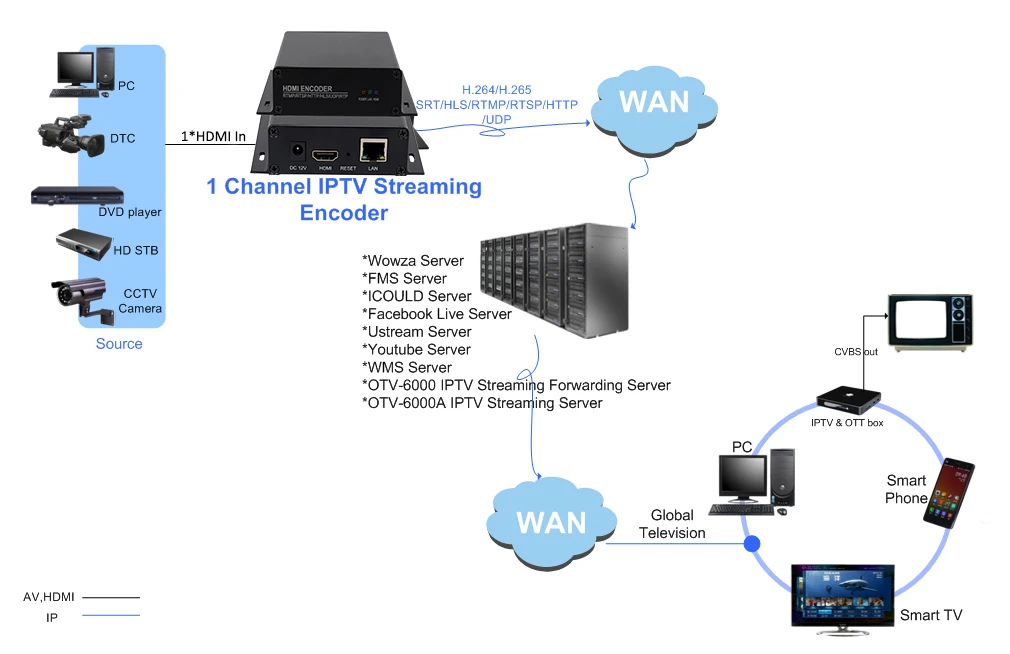 OTV-HE1Y H.265/H.264 Потоковое вещание кодирующее устройство телевидения по протоколу Интернета поддерживает аудио и видео коллекции 1-канальный HDMI вход. Для ввода HDMI, который поддерживает выход 4 групп ip-потоков с четырьмя различными разрешениями (до 1080p) и еще четыре различных битрейта для удовлетворения различных размеров экрана и различных условий полосы пропускания. Каждая группа ip-потоков поддерживает виды основных протоколов вывода (HLS, RTMP, HTTP, RTSP, UDP), это позволяет Кодировщику передавать ip-потоки H.264/H.265 независимым ip-выходом на различные сервера для приложений IPTV & OTT. Таких как Facebook сервер, YouTube сервер, Ustream сервер, Adobe Flash сервер, Wowza медиа сервер и некоторые другие сервера на основе HLS/UDP/RTSP/RTMP/HTTP/ONVIF протоколов. Кроме того, предоставление имени пользователя, функции соответствия паролем, которые требуются от сервера назначения, чтобы избежать потоковой передачи, которая не авторизована.