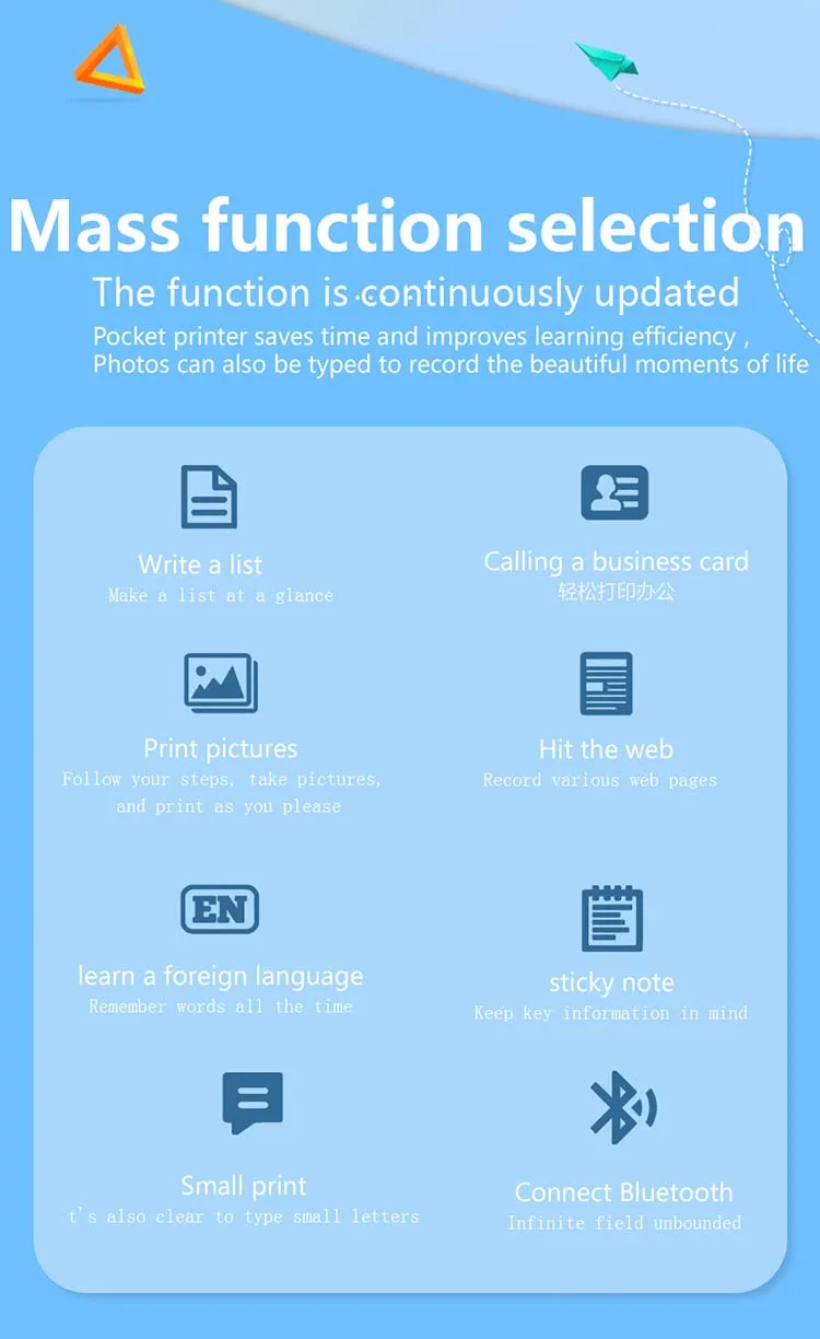 Встроенный аккумулятор емкостью 1000 мА · ч, работающий при низком уровне шума, термопринтер не нуждается в чернильном картридже при использовании, низкая стоимость эксплуатации.