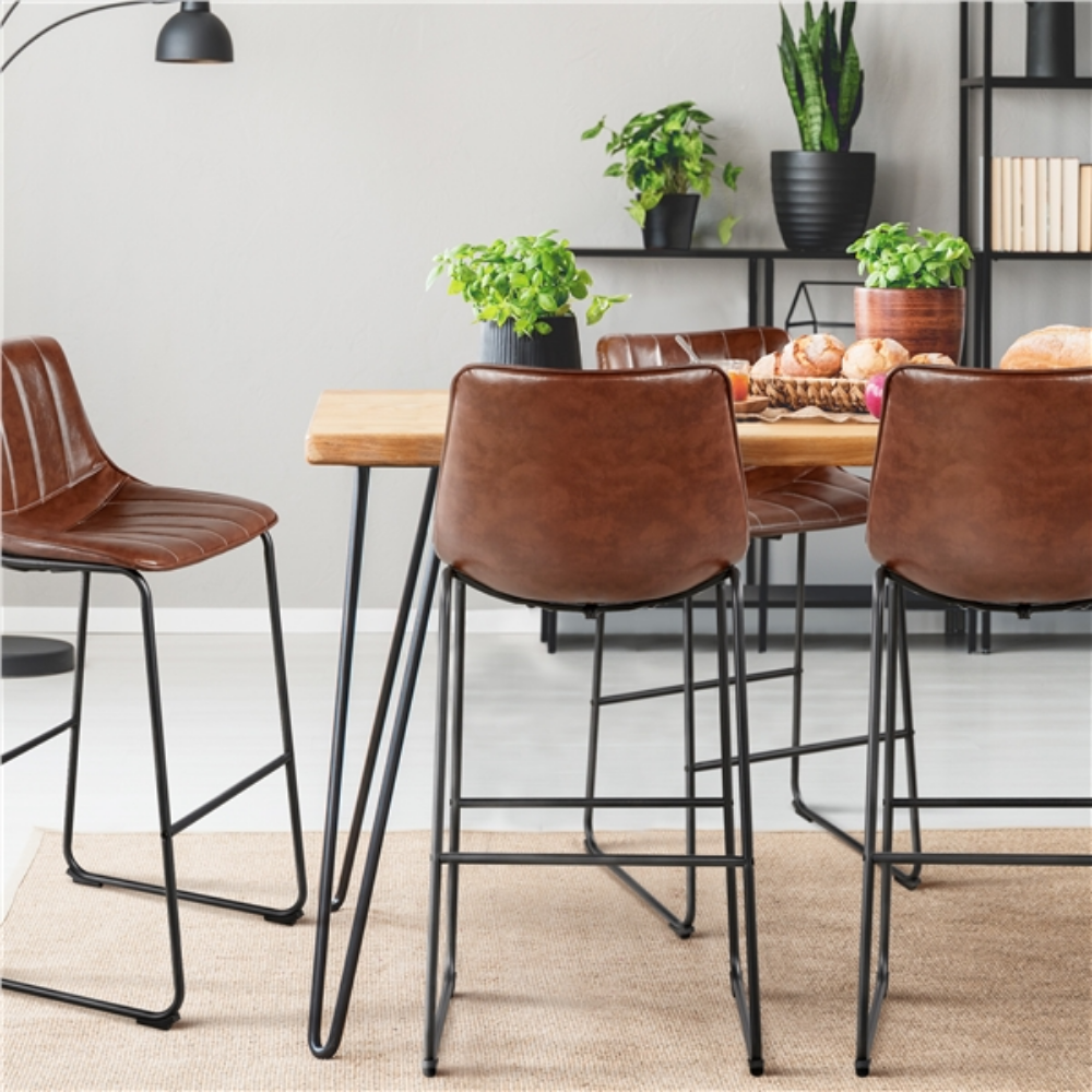 Эта пара высоких обеденных стульев изготовлена из отборных материалов, фанеры, ПУ, пены, металла и нетканого материала. Стул поддерживается металлическими ножками, а сиденье завернуто из искусственной кожи. Чтобы улучшить свойства, мы добавляем спинку и подставку для ног к стулу. Качественные материалы гарантируют длительный срок службы нашей продукции. Стильный дизайн и прочные материалы и комфортные ощущения, эти два барных стула не подведут вас!