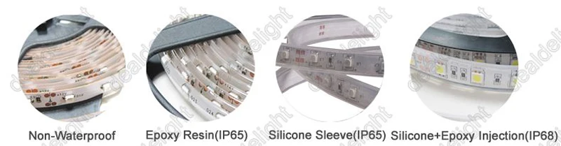 Покрытие из эпоксидной смолы (IP65) ------- светодиодный слой сброшен с эпоксидным полимерным клеем/полиуретановым Гуле, чтобы получить водонепроницаемое покрытие на поверхности, широко используемое в помещении и на открытом воздухе. Идеально подходит для баров, однако не следует использовать в местах с тяжелым водопадом. IP65 чрезвычайно трудно разрезать, припой и повторное уплотнение, так как эпоксидная смола должна быть тщательно вырезана, прежде чем паять.