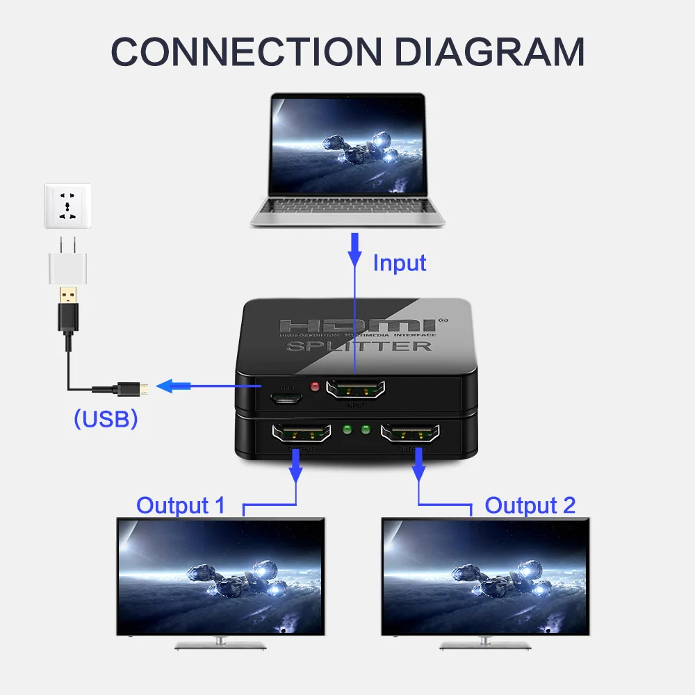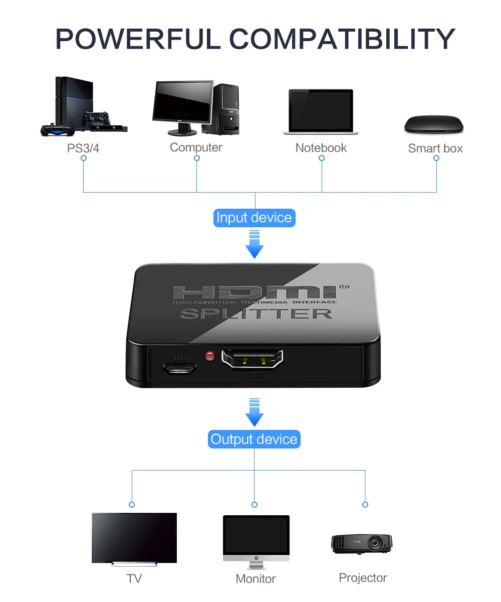 HDMI сплиттер 1x2 предлагает HD видео решение для супермаркетов, торговых центров, HDTV, STB, DVD, проекторных заводов, центров управления данными, распределения информации, презентаций конференц-залов, образования и обучения, выставочные залы, домашние кинотеатры и многое другое.