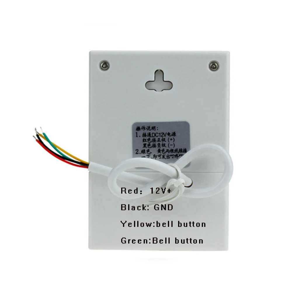 Здесь высококачественный электронный дверной звонок может подключаться к клавиатуре контроля доступа, которая имеет кнопку дверного звонка, звук звонит и Громкость высокая, питание от контроллера контроля доступа, нет необходимости в дополнительной батарее, также вы можете подключить Удлинительный кабель и установить его в любом месте. Использование: система контроля доступа мощность: DC12V, без необходимости батареи. Размер: 86x62x23 мм