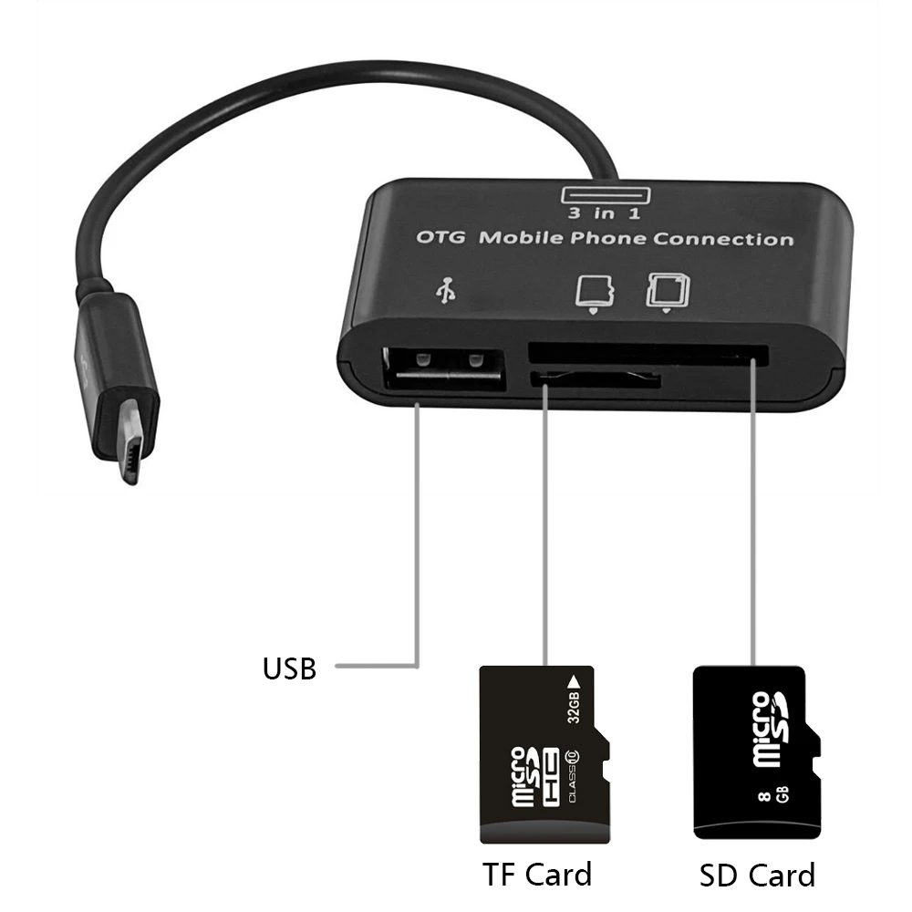 3 in 1 Micro USB Hub Host SD TF Card USB Flash Drive Reader OTG Android Mobile Phone Connection Adapter with Cable