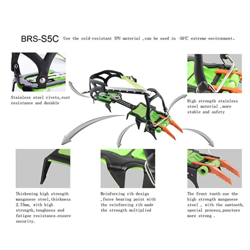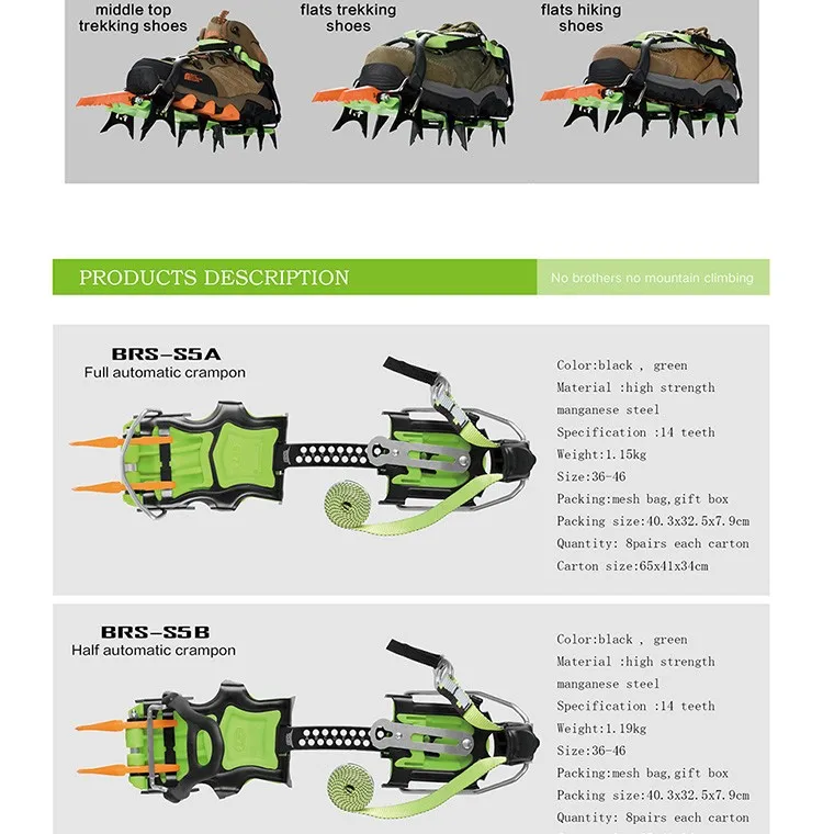 Тип изделия: ледяной захват Название бренда: BRS Материал: марганцевая сталь Номер модели: BRS-S5A с полным зажимом BRS-S5B с полузажимом BRS-S5C пряди crampon Длина зуба: 40 мм Размер: для размера США 5,5-11,5. (Длина стопы 22,5 см-30 см) Вес: 1,2 кг Описание: пара (две Туфли-пара) скобы для походов Особенности: альпинистские ледяные скобы Упаковка:, сумка Оксфорд Советы: подходит для всех видов сложных видов снега и льда