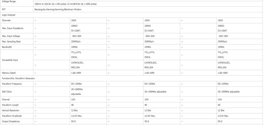 4CH Oscilloscope + 16CH Logic Analyzer + 1CH Function/Arb. Waveform Generator + 16 Bits Word Generator + 1CH EXT Trigger.