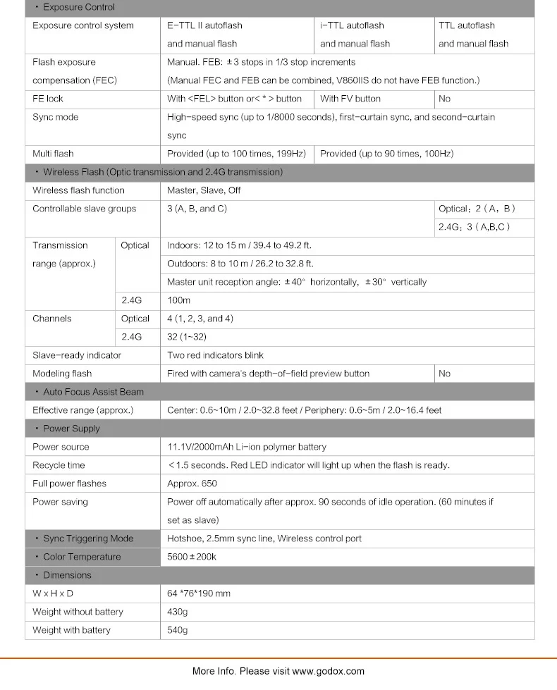 Компенсация экспозиции вспышки (FEC): Руководство FEB: ± 3 остановки с шагом 1/3 стоп (V860II-S не имеет функции FEB)