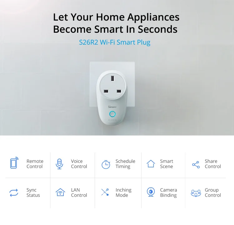 SONOFF S26R2-это обновленная версия S26 со стандартом ЕС (Type-F)/UK/BR, которая обеспечивает самый простой способ автоматизации ваших устройств и приборов, это умная сверхмощная штепсельная розетка Wi-Fi, которая устанавливается в любом сосуде, пользователи могут мгновенно конвертировать любую вилку в умную розетку с удобной функцией таймера, которая работает на смартфоне пользователя. Вы можете включить/выключить любое подключенное устройство либо в приложении eWeLink, либо нажав ручную ручку управления вилкой Wi-Fi. Вы можете установить таймер обратного отсчета/один/повторения для автоматического включения/выключения Wi-Fi управляемой розетки в приложении. И может поделиться вилкой WiFi с вашей семьей, чтобы вы могли управлять вместе, это делает его идеальным для управления освещением и другими бытовыми приборами. Более того, S26R2 также совместим с большинством голосовых помощников, таких как Amazon Alexa и Google Assistant.