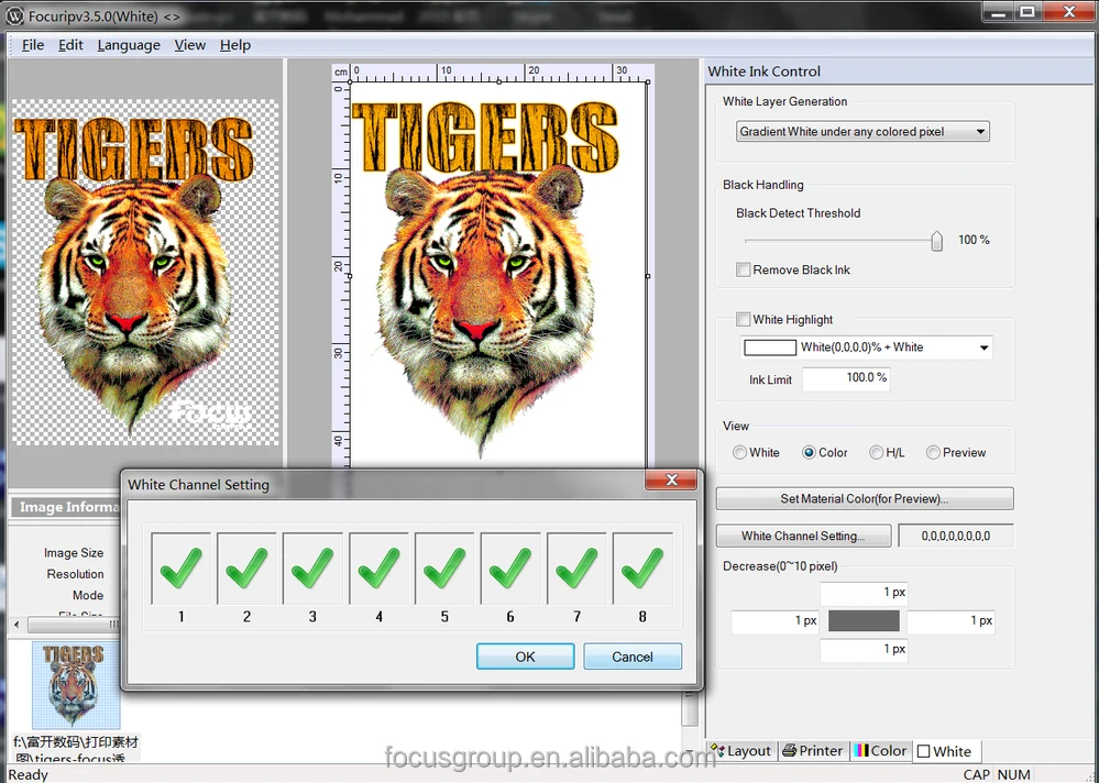 11. Хорошее управление цветом FocusRIP, чтобы вы получили хороший полутон и быстрый результат цвета, может регулировать предел чернил, размер падения белых чернил, Тип Слоя белых чернил, тип Точек Чернил, чернила chanel настраиваемые настройки опционально...