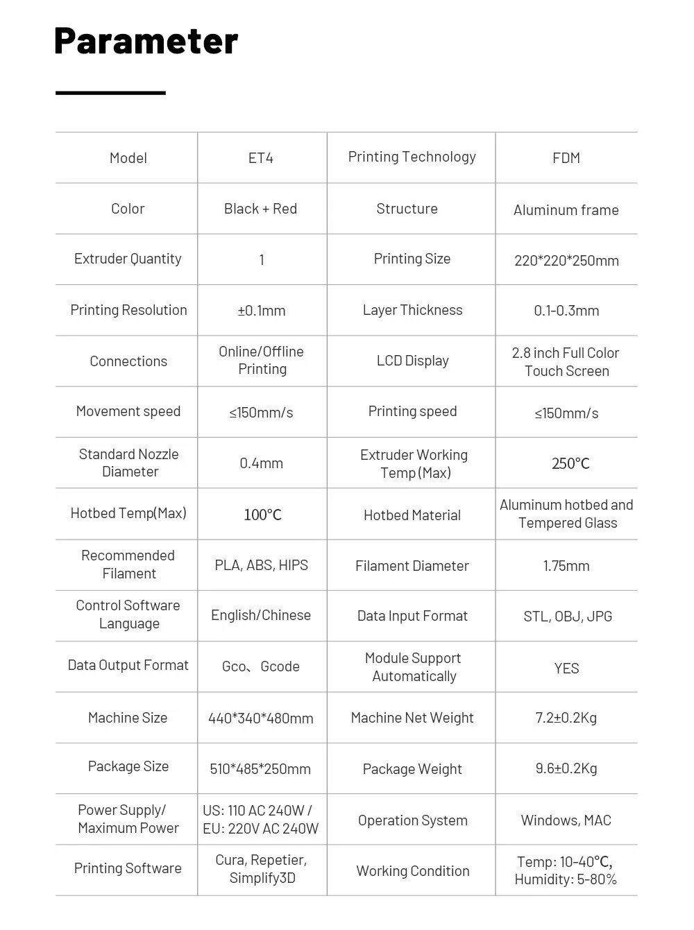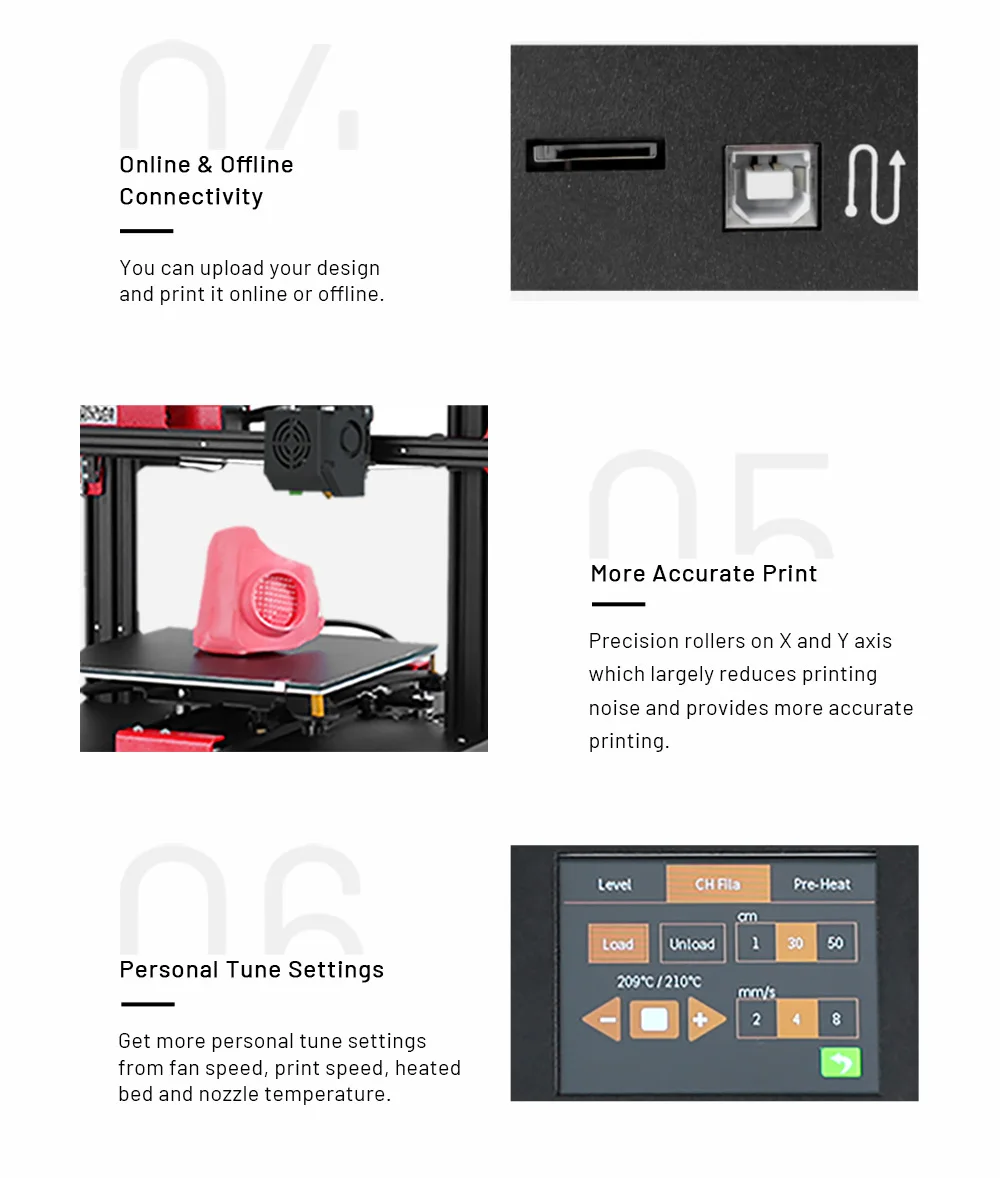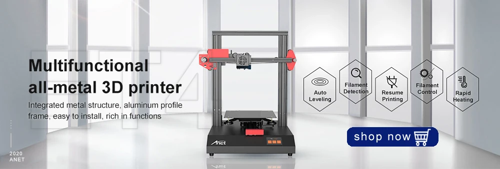 Anet 3D принтер ET4 основные преимущества 1. Автоматическое выравнивание кровати 2. Восстановление прерывания печати/отключения электроэнергии 3. Обнаружение накала 4. Автоматическое назначение нити 5. Интегрированная модульная конструкция 6. 2,8-дюймовый сенсорный экран 7. Онлайн и автономное подключение 8. Чипсет промышленного класса 9. Более точный принт 10. Хорошо сделанная полностью металлическая рама 11. Личные настройки