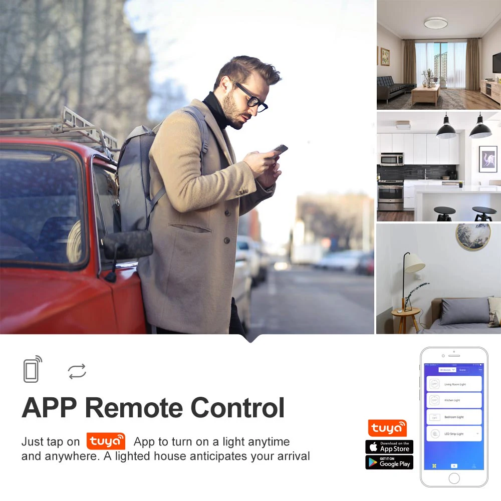 • Пульт дистанционного управления Wi-Fi: включение/выключение света из любого места • Поддержка приложений: Бесплатное мобильное приложение для iOS и Android (Smart Life) • Совместимость: работает с Amazon Alexa, Google Home • Независимое управление: Контролируйте каждую банду отдельно • Состояние синхронизации; Статус устройства в режиме реального времени предоставляется в приложении • Время: установка таймеров запланированного/обратного отсчета для включения/выключения в указанное время