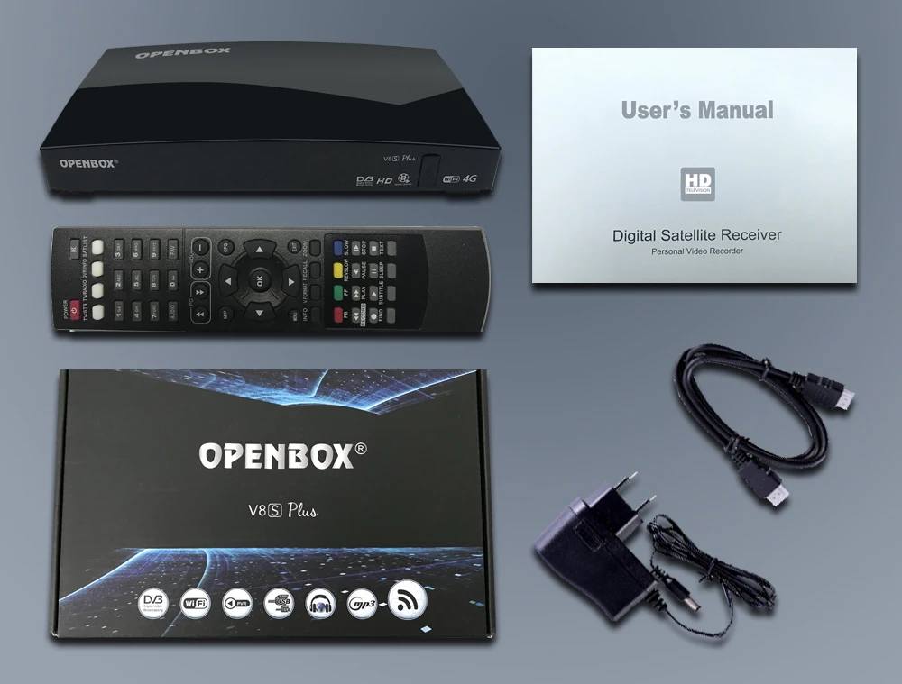 SOLOVOX V8S PLUS или OPENBOX V8S PLUS сопровождается адаптером питания, кабелем HDMI, пультом дистанционного управления и руководством пользователя.