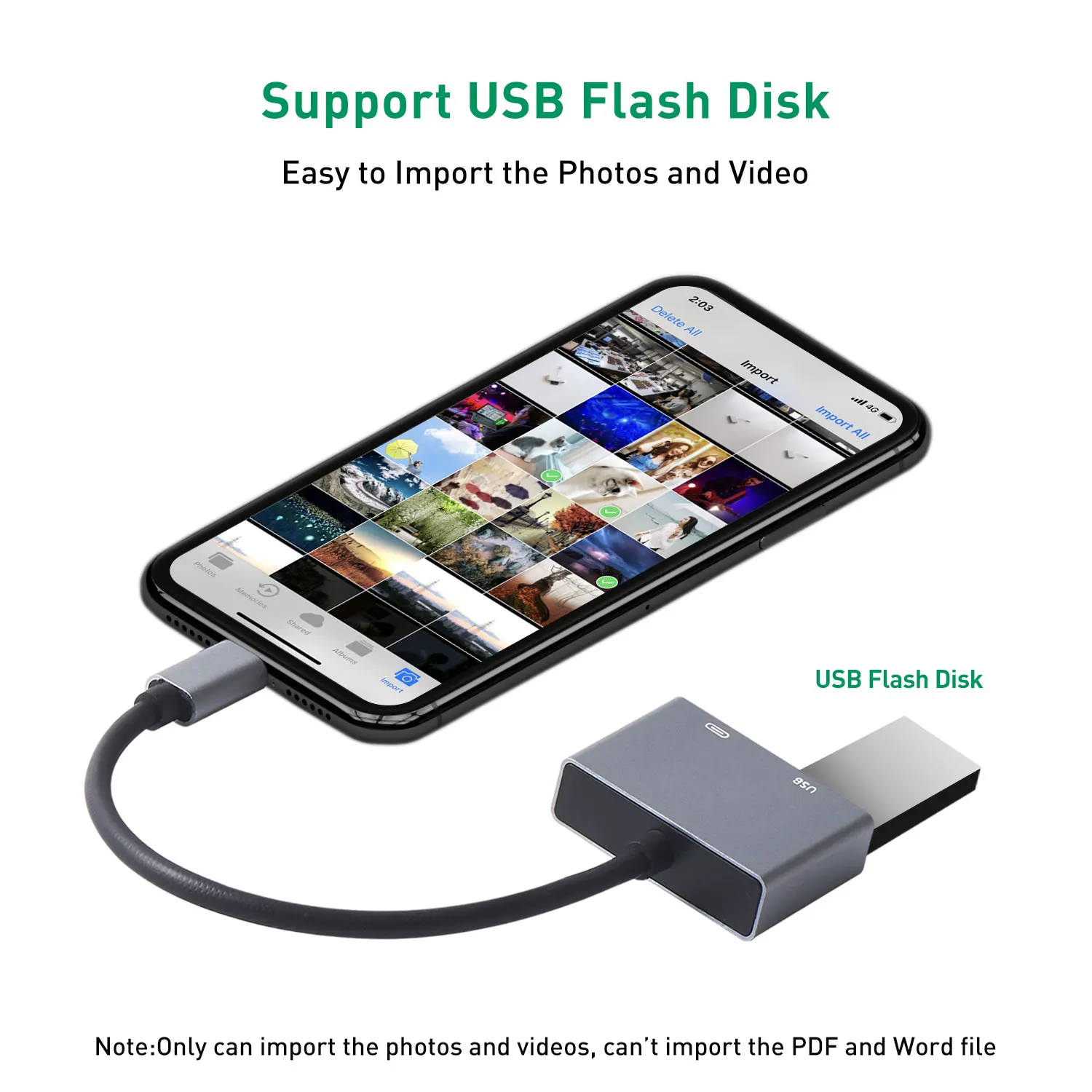 При подключении к usb-устройству вы не можете поместить фотографии непосредственно на u-диске, необходимо создать новый файл с именем «DCIM» (у большинства камер есть этот файл). Затем отправьте фотографии в этот файл, сохраненный в формате JPEG, с именем IMG_XXXX; И видео должно быть сохранено в формате H.264 или MPEG-4, с именем MVI_XXXX. Вставьте USB в OTG, через 3-7 секунд iPad и iPhone автоматически всплывет окно изображения.