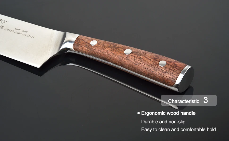 Материал лезвия:Импортированная Германия 1,4116 нержавеющая сталь из Германии ThyssenKrupp группа, до высокого стандарта Германии Din17400.