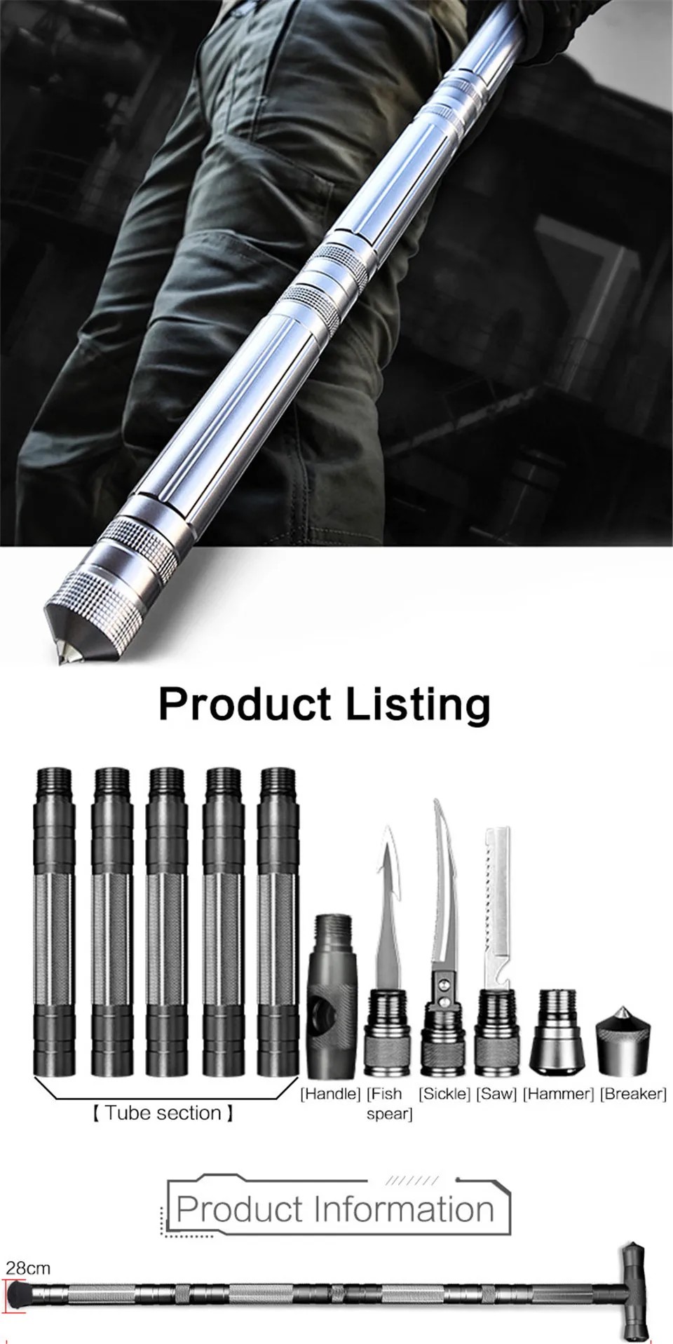 (3) ручка может быть сформирована для прямой или T-HANDLE. Устойчивый, прочный и идеальный размер для мужчин и женщин для прогулок и походов. Его можно собрать в аварийный молоток, инструмент или палку в течение 1 минуты.