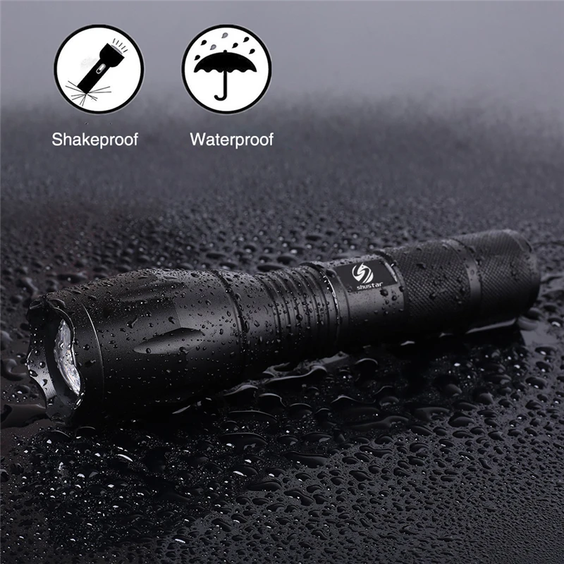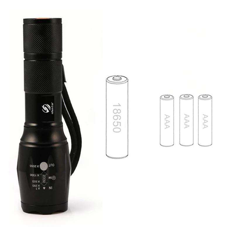 ED Flashlight Quantity: 1 PCS LED Emitter: Q5,T6, L2, Mode: 5-Modes (high - medium - low - SOS - Strobe) Lifespan: 100,000 Hours Color: Black Emitted Color: White Light Lens: Convex Lens Case Material: Durable aircraft-grade aluminum Battery: 1 x 18650 / 3 x AAA (18650 battery needs to be purchased, AAA battery is not included)