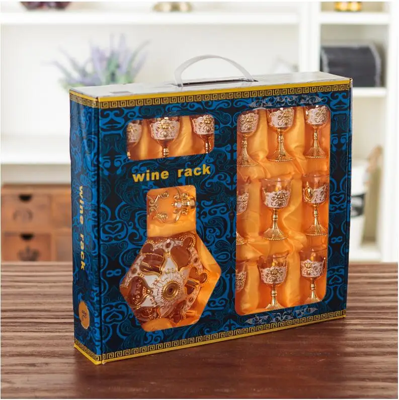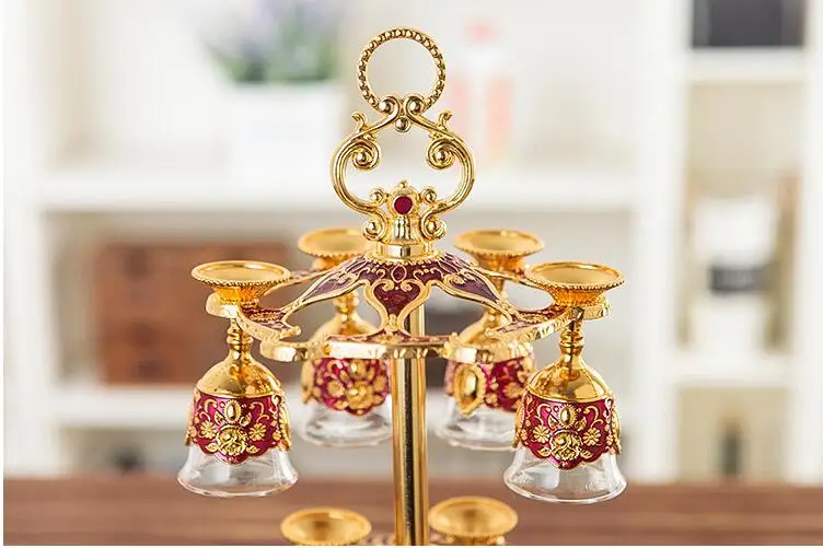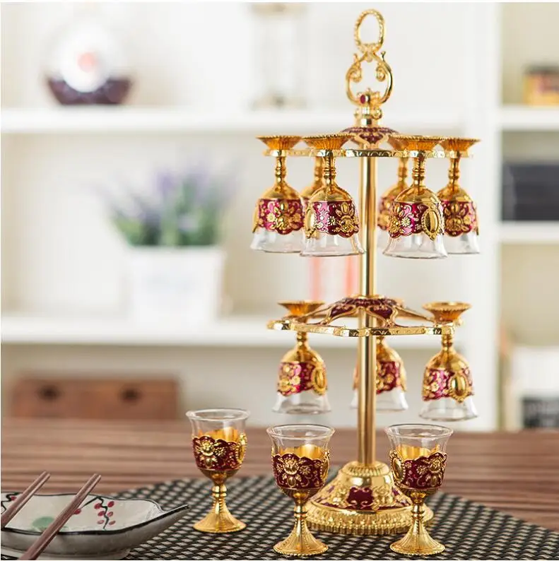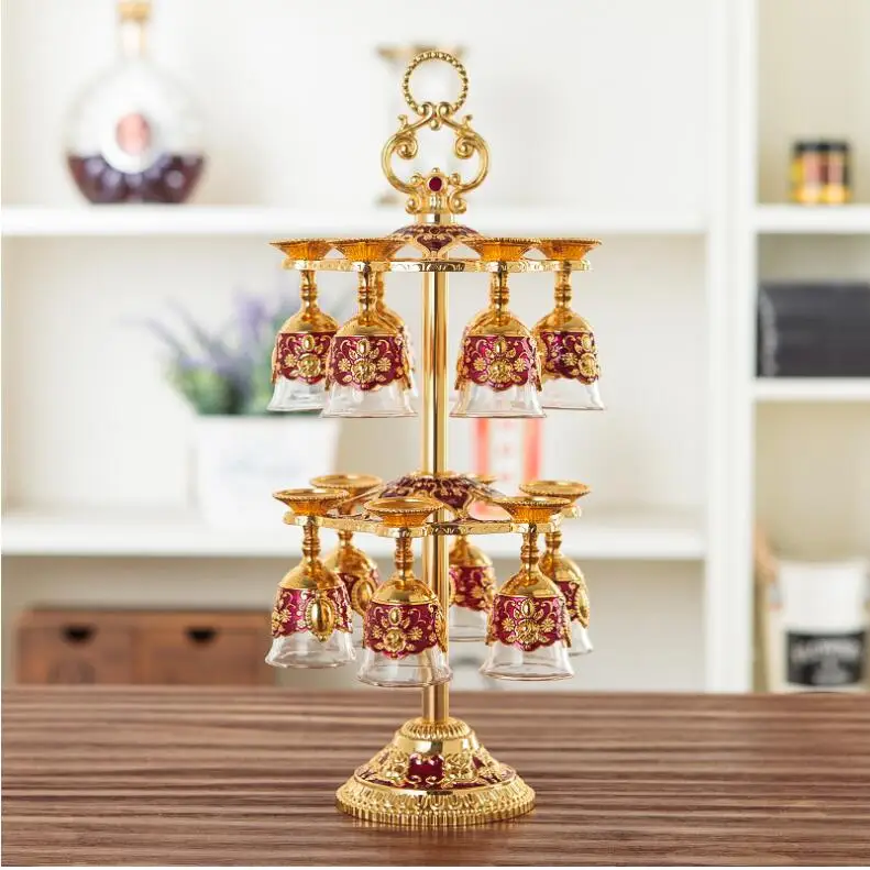 Item no : JB006 Item name :Europe alloy metal Wine glass cups Material :zinc alloy metal color: bronze color , gold plated Size 6cups size:total height 22cm, total width16cm 12cups size; total height 37cm, total width 16cm. cups diameter 4cm, total height 9cm. volume; 20ml Feature:Europe alloy metal frme+ Wine Glas Cups , 6cups/ 12cups / set. beautiful cups for wiskey.