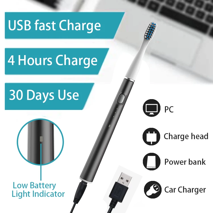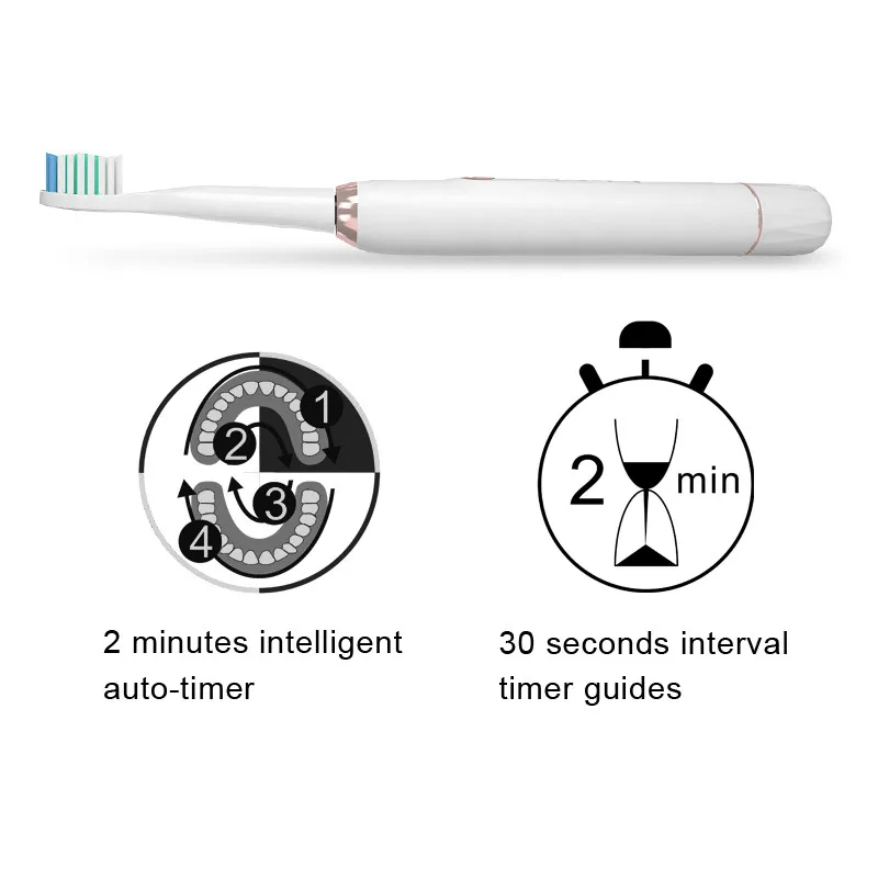 Описание продукта: 1. Модный дизайн и небольшой размер 2. Класс водонепроницаемости IPX7 3. Три режима, включая чистый, мягкий, белый 4. Частота вибрации 18000-26000 раз/мин 5. Два миниатюрных интеллектуальных автоматического таймера, 30 сенкондов интервала таймера направляющих 6. Аккумулятор 300 мАч, 3,7 в 7. Беспроводная зарядная станция, время зарядки около 4 часов, полная зарядка может использоваться 20 дней Упаковочный лист: 1 * ручка электрической зубной щетки 2 * насадки для зубной щетки 1 * зарядное устройство с usb-портом 1 * Руководство пользователя Изображение