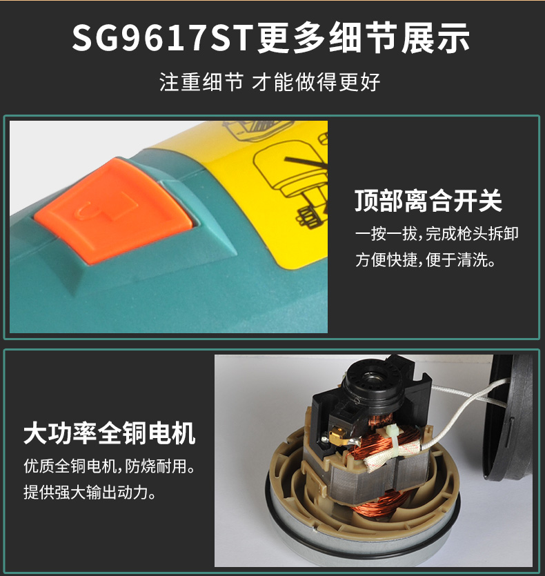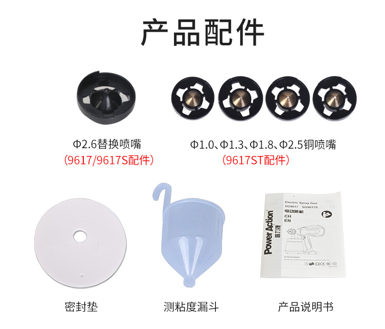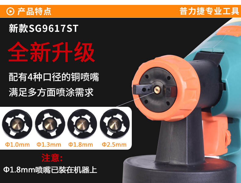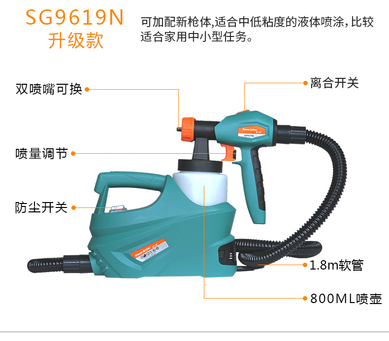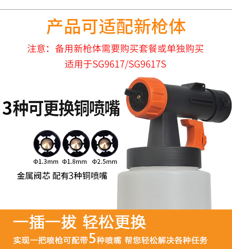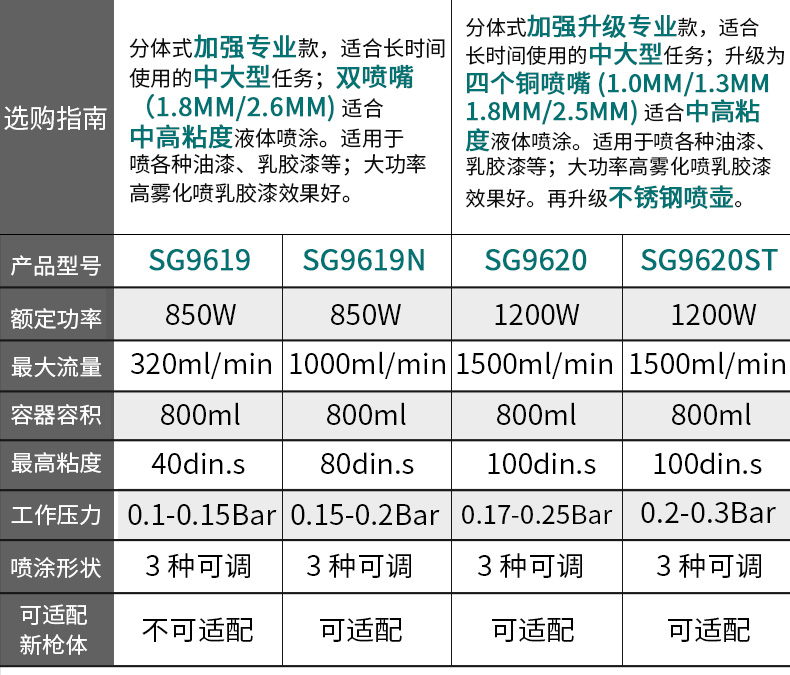 Примечание: SG9617, SG9617S, SG9617ST машины не должны быть помещены с лицевой поверхностью, чтобы предотвратить попадание краски обратно в двигатель и повреждение двигателя. Покупатели, которые не выполняют, как требуется, несут ответственность за потерю. SG9619: это модель «сделай сам» для раздельных семей, подходит для долгосрочного использования. Одинарная ножка (1,8 мм) для маловязких жидкий спрей приложений. Подходит для всех видов красок. Латексные краски и покрытия не рекомендуется. SG9619N: это модель «сделай сам» для раздельных семей, подходит для долгосрочного использования. Двойная Насадка (1,8 мм) для средней и низкой вязкой жидкости брызг. Подходит для всех видов красок, латексных красок и т. д. SG9620: это профессиональная модель сплит-типа, подходящая для более длительного использования. Двойная Насадка (1,8 мм/2,6 мм) для среднего и высокого уровня вязкой жидкости брызг. Подходит для распыления различных красок, латексных красок и т. д. Высокая мощность, высокая распылительная эмульсионная краска хорошо работает. SG9620ST: это профессиональная модель сплит-типа, подходящая для более длительного использования. Обновление до 4 шт сопла (1,1 мм/1,3 мм/1,8 мм/2,6 мм) для среднего и высокого уровня вязкой жидкости брызг. Подходит для распыления различных красок, латексных красок и т. д. Высокая мощность, высокая распылительная эмульсионная краска хорошо работает. Обновите лейки из нержавеющей стали.Номер продукта