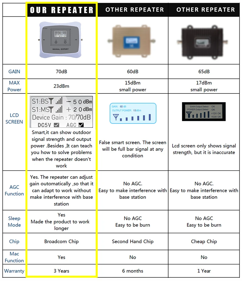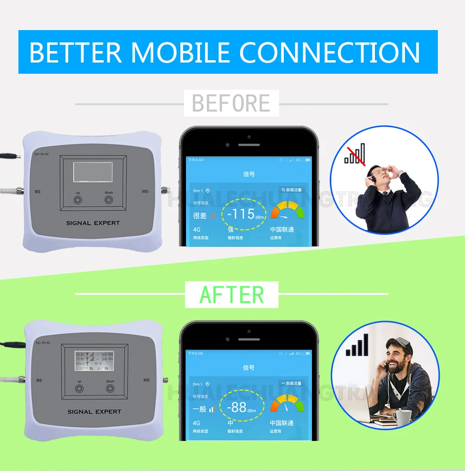 1. Улучшите голос и 2G 3G 4G интернет. 2. Умный ЖК-дисплей, показывает силу сигнала в реальном времени. 3. С функцией ALC/AGC Можно контролировать усиление автоматически. Избегайте помех базовой станции 4.(полоса 5) 850 МГц-частота подключения: 824-849 МГц/частота нисходящего канала: 869-894 МГц (Полоса 4) 1700 МГц -- частота подключения: 1710-1755 МГц/частота нисходящего канала: 2110-2155 МГц 5. Простая установка. 6. Тип разъема: SMA-female. 7. Режим сна. Интеллектуальная энергосбережение.
