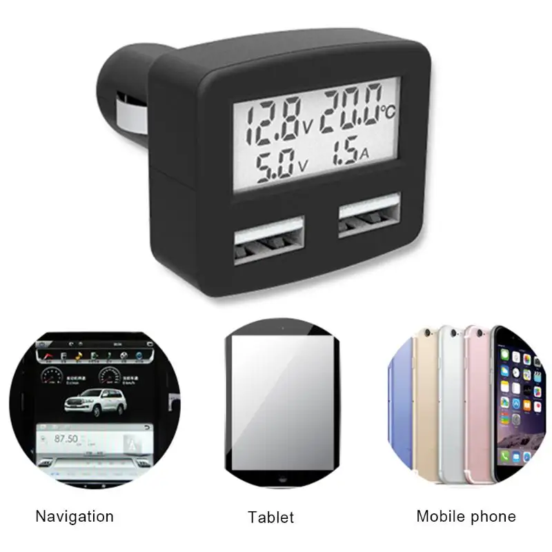This product can plug in 12V or 24V car cigarette lighter socket, charge mobile phone via USB, the maximum output current can reach 3.2A. Meanwhile, display screen shows the car storage battery voltage, in-vehicle temperature, charging voltage and current synchronously.