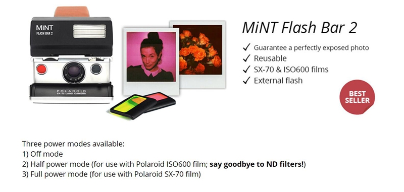 Одна вещь, которую мы знаем о Polaroid SX-70, это то, что он любит яркий светильник. Солнечный свет, прожекторы, фары, они не слишком придирчивые. Если вы хотите снимать в ночное время или в помещении, вы, вероятно, захотите получить один из этих флеш-баров аналоговыми экспертами, мятным. Он работает от батареи, и слоты прямо в гнездо вспышки вашего SX-70, так что вы будете готовы снимать, когда солнце опускается. И он даже поставляется с двумя цветными фильтрами, для тех случаев, когда вы ищете что-то особенное.(Текст от Polaroid Originals)