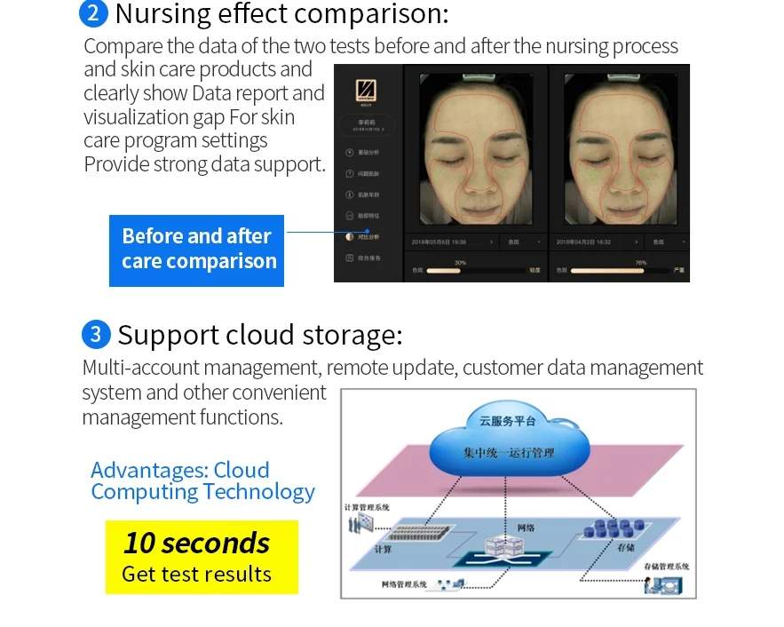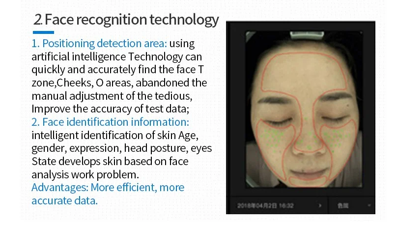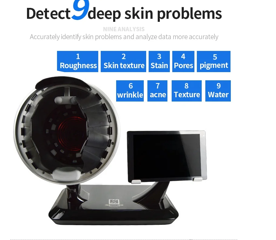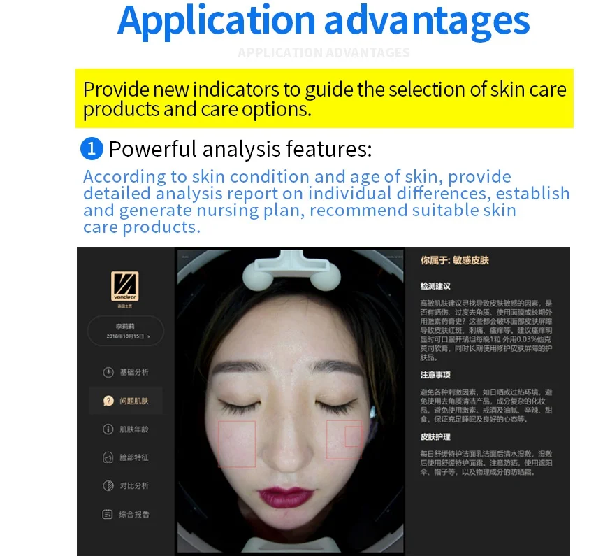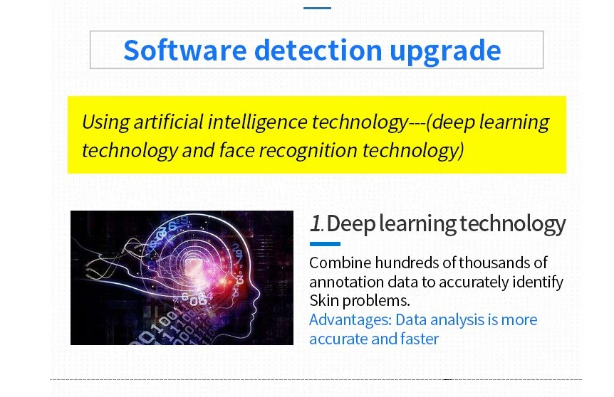 Это метод использования методов глубокого обучения в сочетании с опытом дерматологов для точного количественного определения кожи-новейшие методы диагностики кожи. Его внешний вид согласно опыту доктора, так что лечение кожи прощается с историей прошлого медицинского опыта, может точно и количественно диагностировать состояние кожи. Он предоставляет врачам и больным более точные, четкие и легко понятные диагностические отчеты о коже для более эффективного лечения и лечения кожи, в том числе: