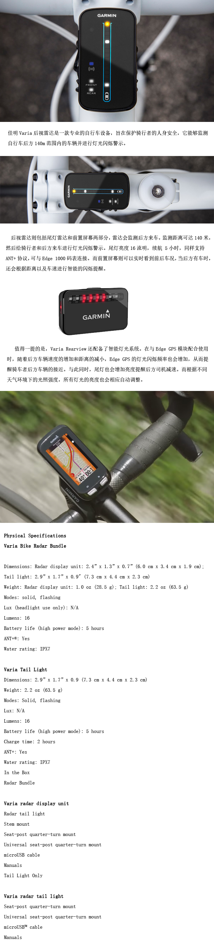 Бренд: Garmin Модель: VARIA RDU + RTL500 Varia велосипед радар Состоит из двух частей, Радарный дисплей Varia и хвостовой свет Vaira Предоставьте вам задний подход к транспортному средству и сделайте предупреждение Велосипедный радар, дальность обнаружения до 140 метров Работает независимо или беспроводно с кромками продуктов Многократный подход транспортных средств может быть обнаружен с помощью радиолокационных дисплеев Edge или Varia и показать близкую относительную скорость и уровень опасности Задние фонари обеспечивают мигающий или постоянный режим освещения для оповещения заднего автомобиля Водонепроницаемый дизайн, прочный и прочный, универсальный велосипедный кронштейн Датчик света автоматически регулирует яркость в зависимости от окружающей среды.Второй раз заказываем с АлиЭкспресс, через этот сайт. Доставкой довольна,быстро и во время. На счёт халатов просто нет слов,заказали со... Читать отзыв полностью...